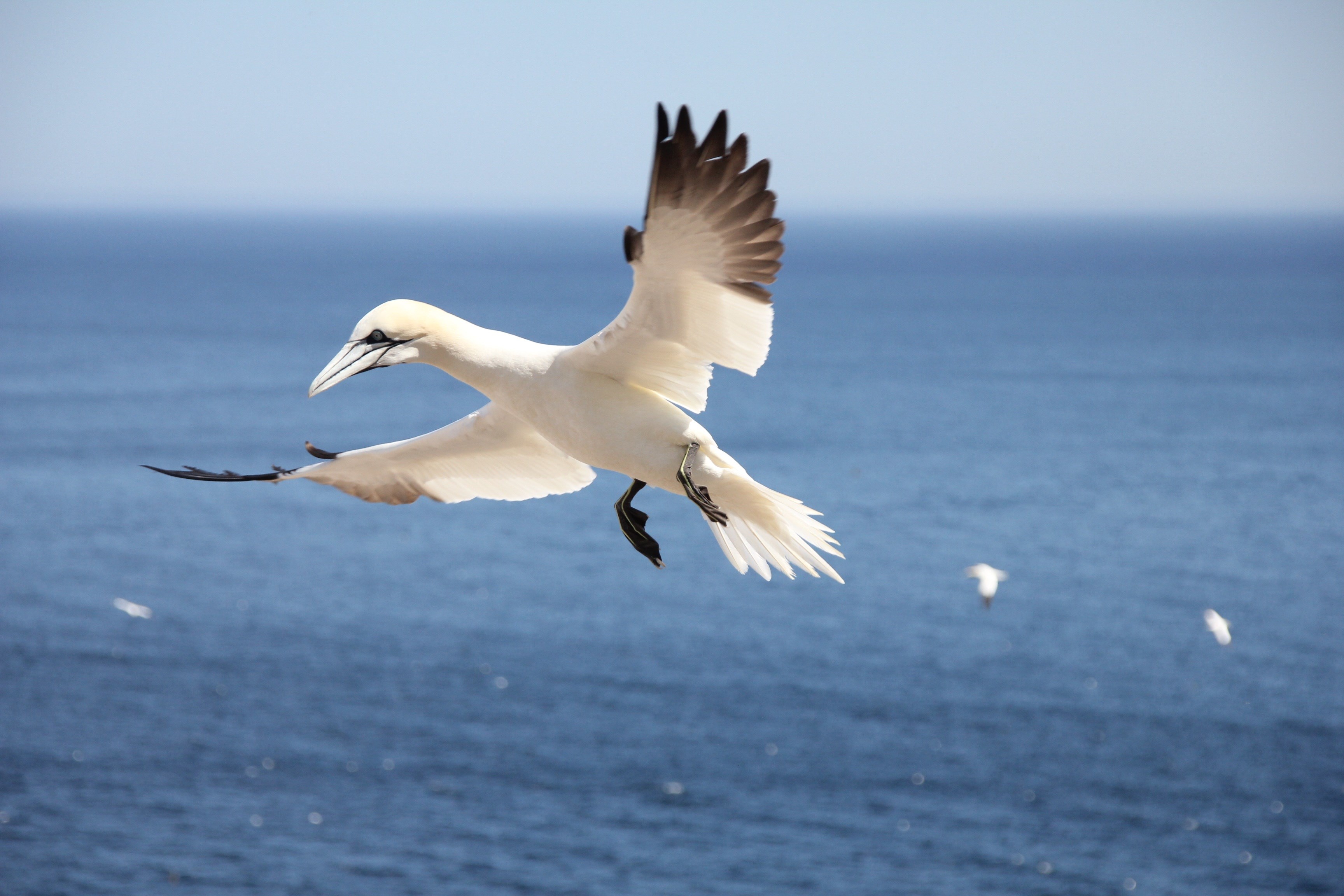 Description: A white bird flying over the ocean with a flock of birds in the background on a sunny day with blue sky.