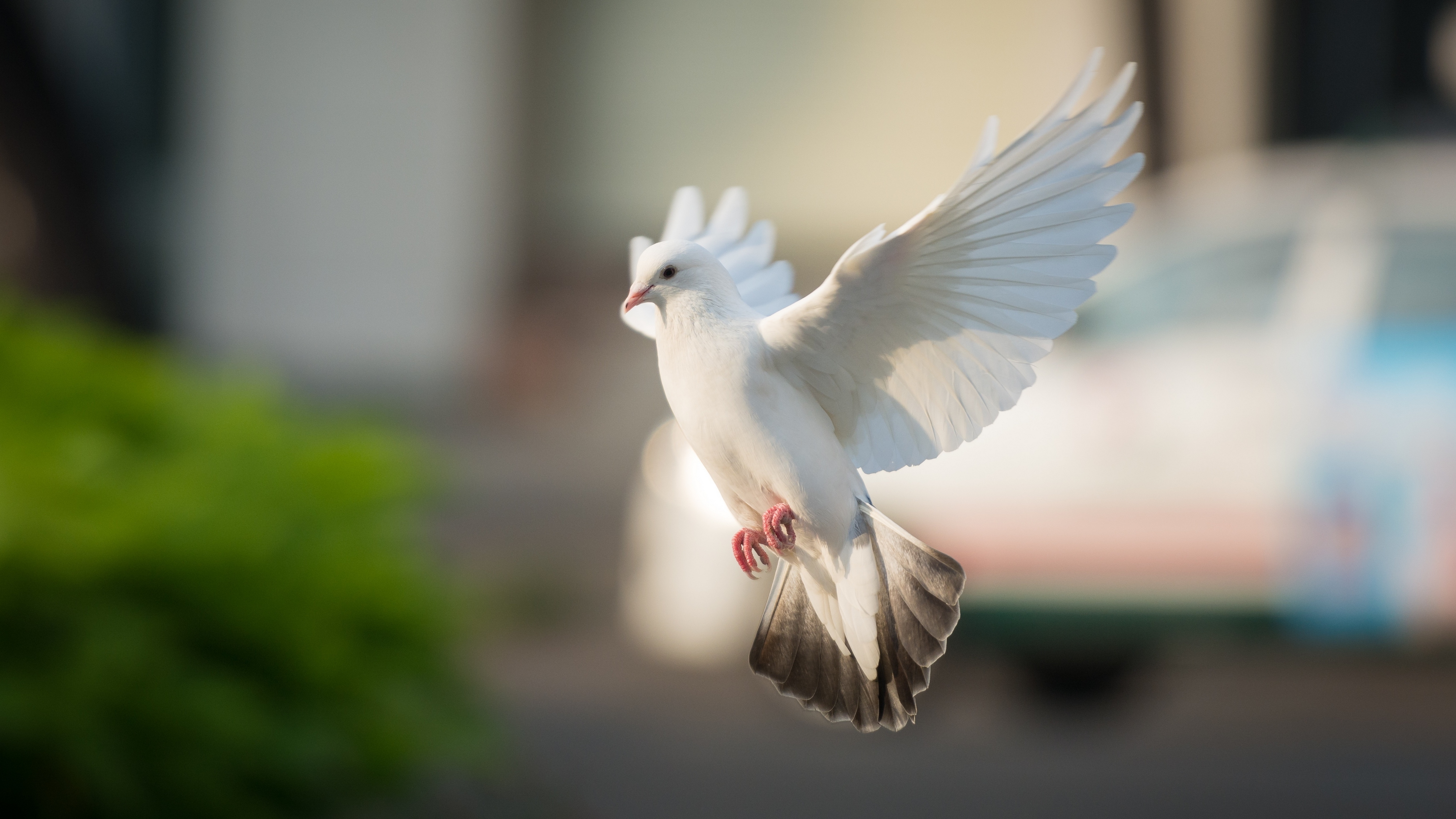 Description: A white bird flying over a street next to a car and a building with a red stripe on it.