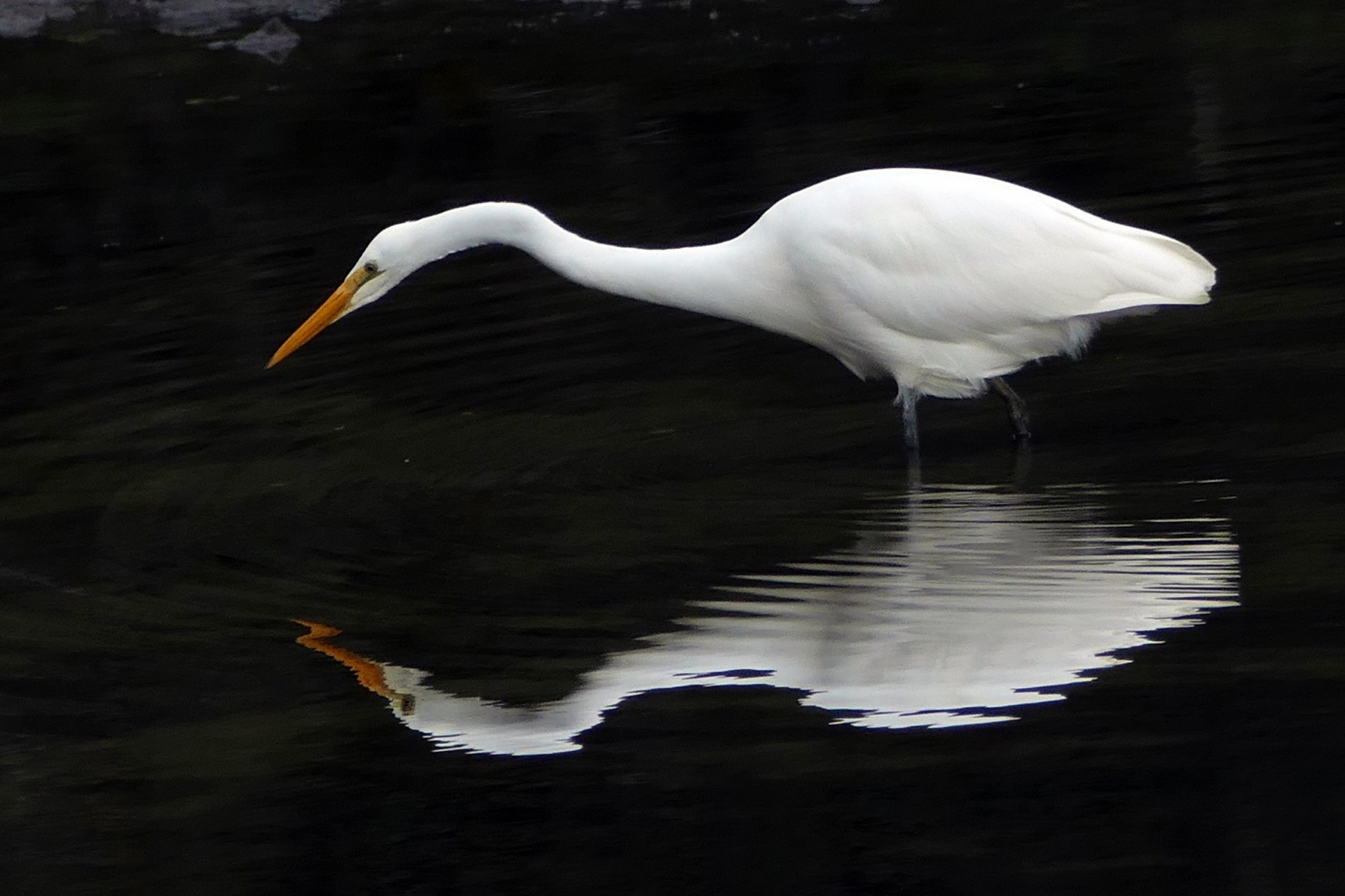Description: A white bird with a long beak standing in water with its reflection on the water surface of the water.