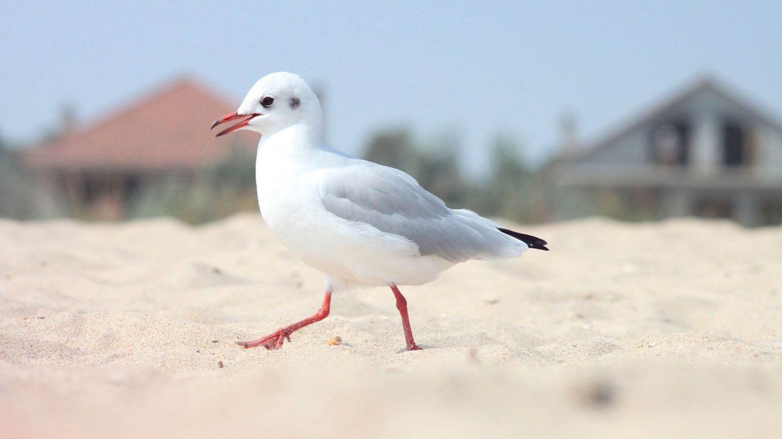 Description: A white bird with a red beak walking on sand near houses in the background and a blue sky in the background.