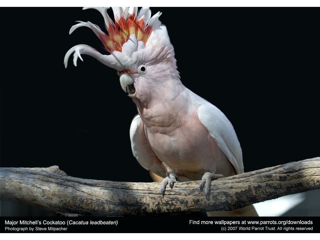 Description: A white bird with a red and yellow mohawk on its head sitting on a branch of a tree branch.