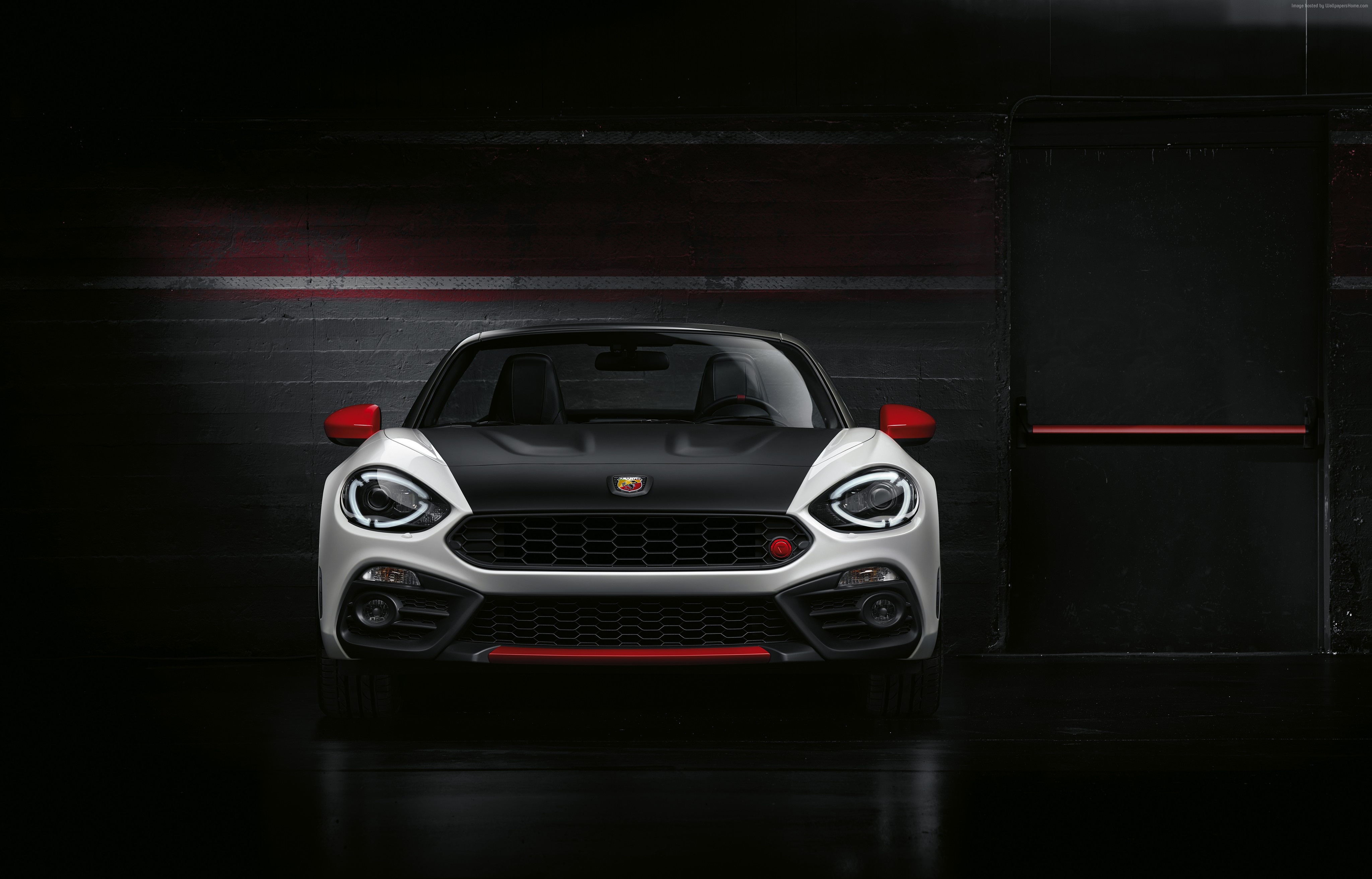 Description: A white and black car parked in a garage next to a black wall and door with red trims.