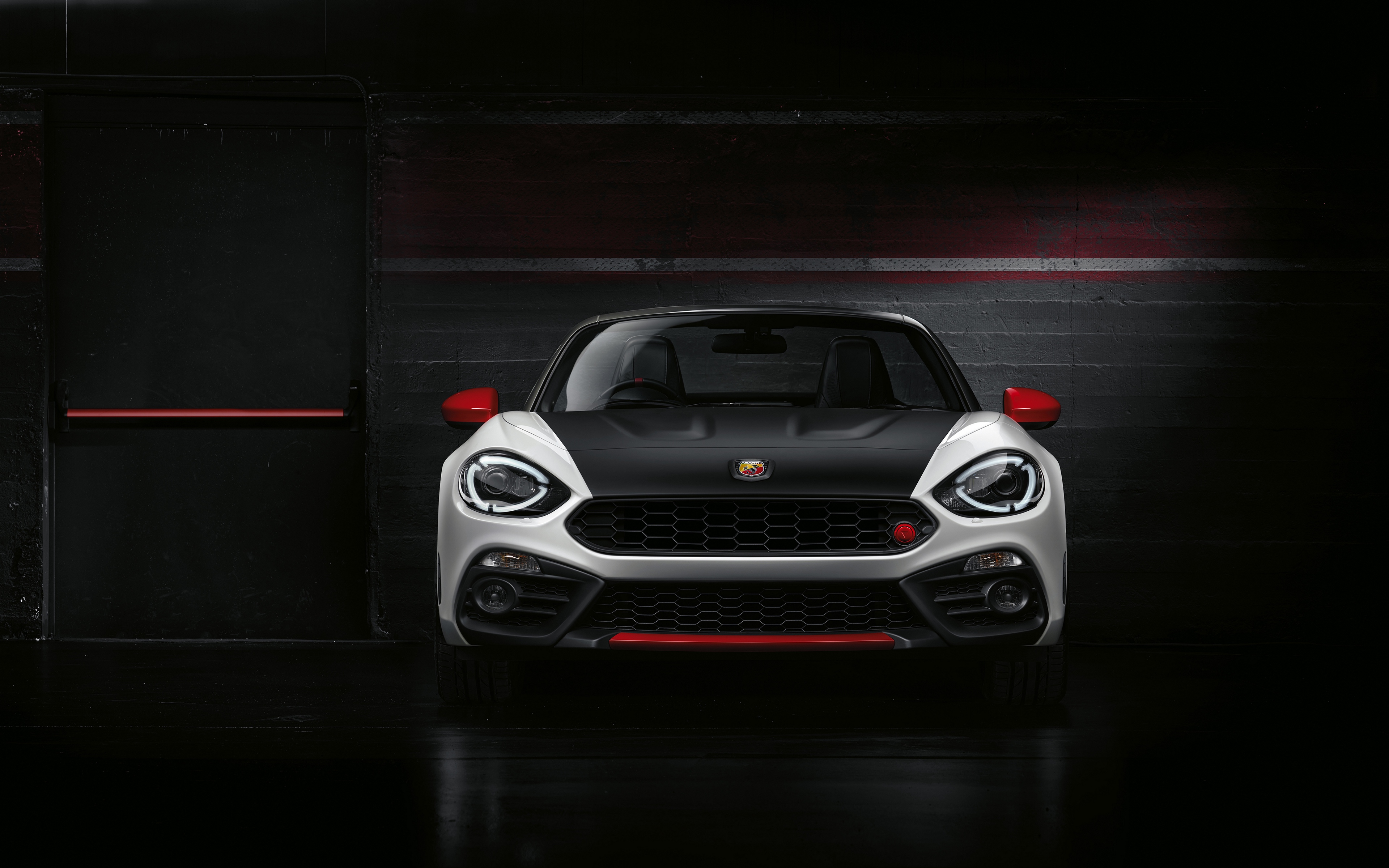 Description: A white and black car parked in a garage next to a red light and a black door with a red light on it.
