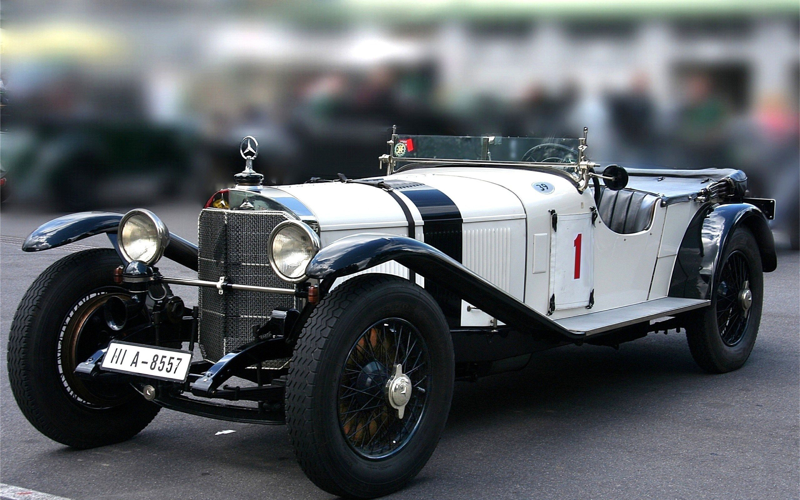 Description: A white and black car is parked on the street with a lot of people in the background and a blurry background.