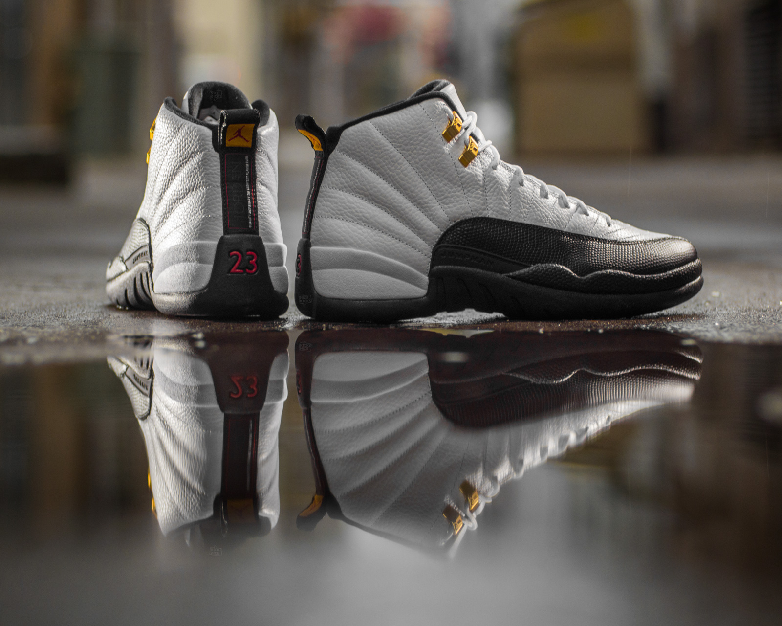 Description: A pair of white and black sneakers on a reflective surface with a reflection of the shoe on the floor.