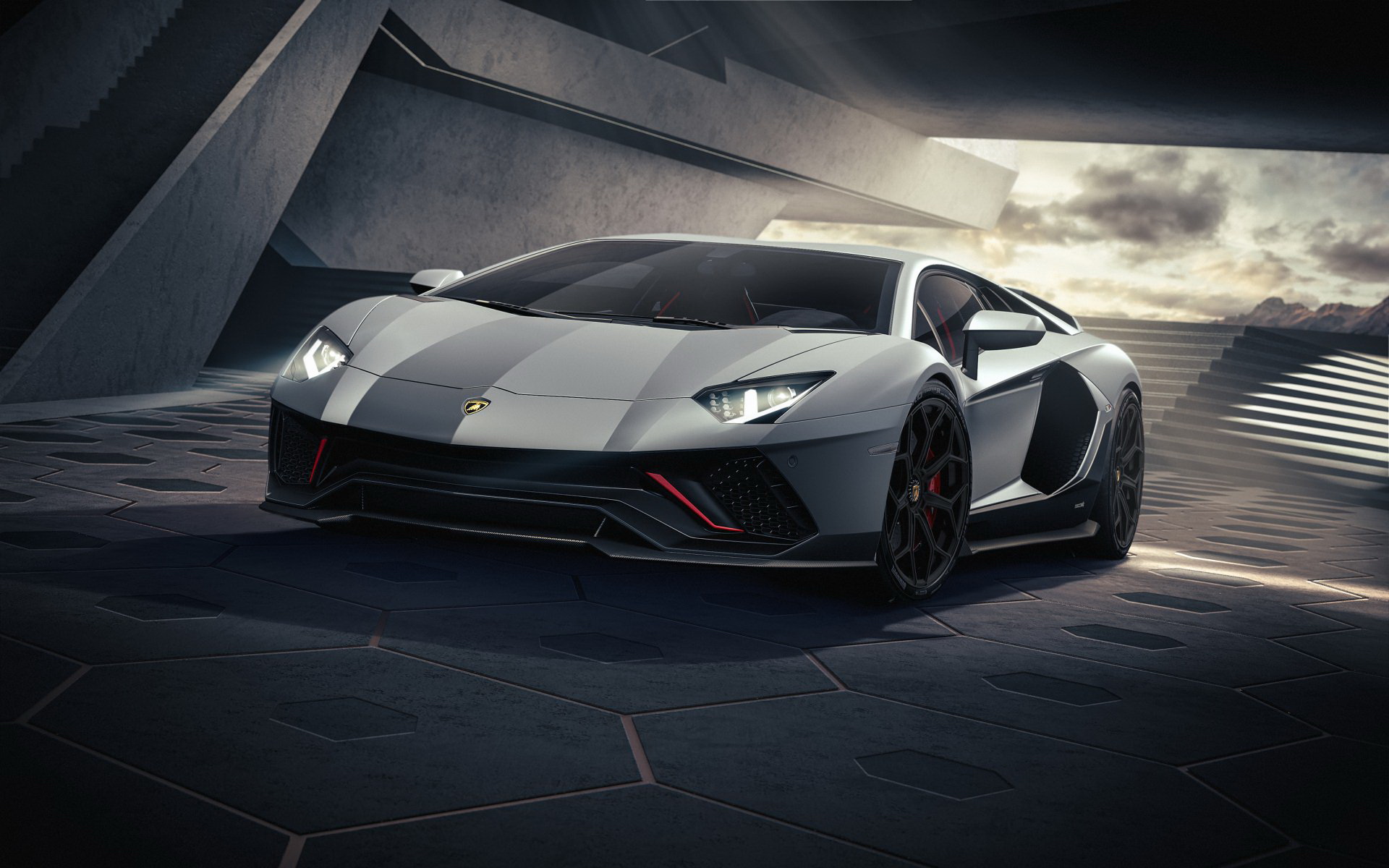 Description: A white and black sports car parked in a tunnel with a sky background and a building in the background.