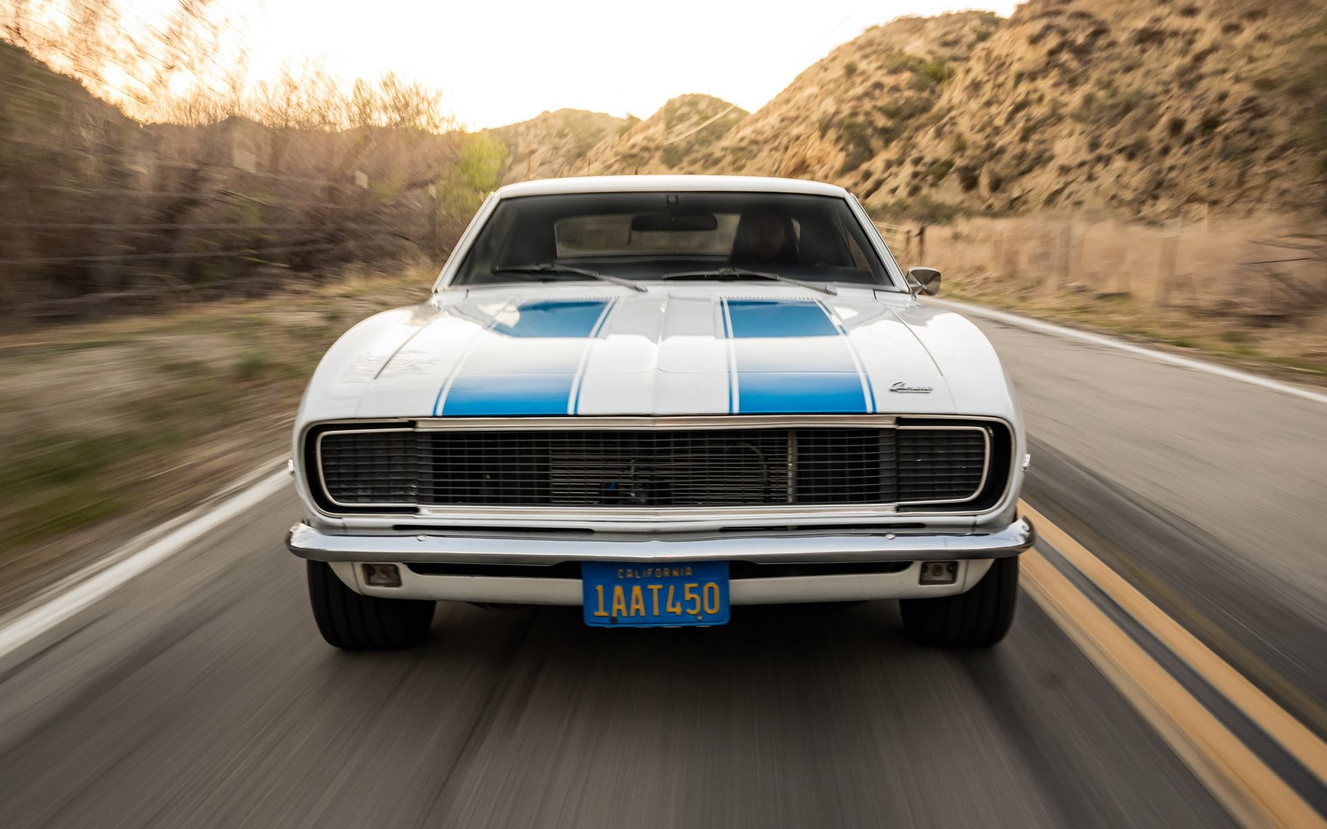 Description: A white and blue car driving down a road with mountains in the background and a license plate on the front.