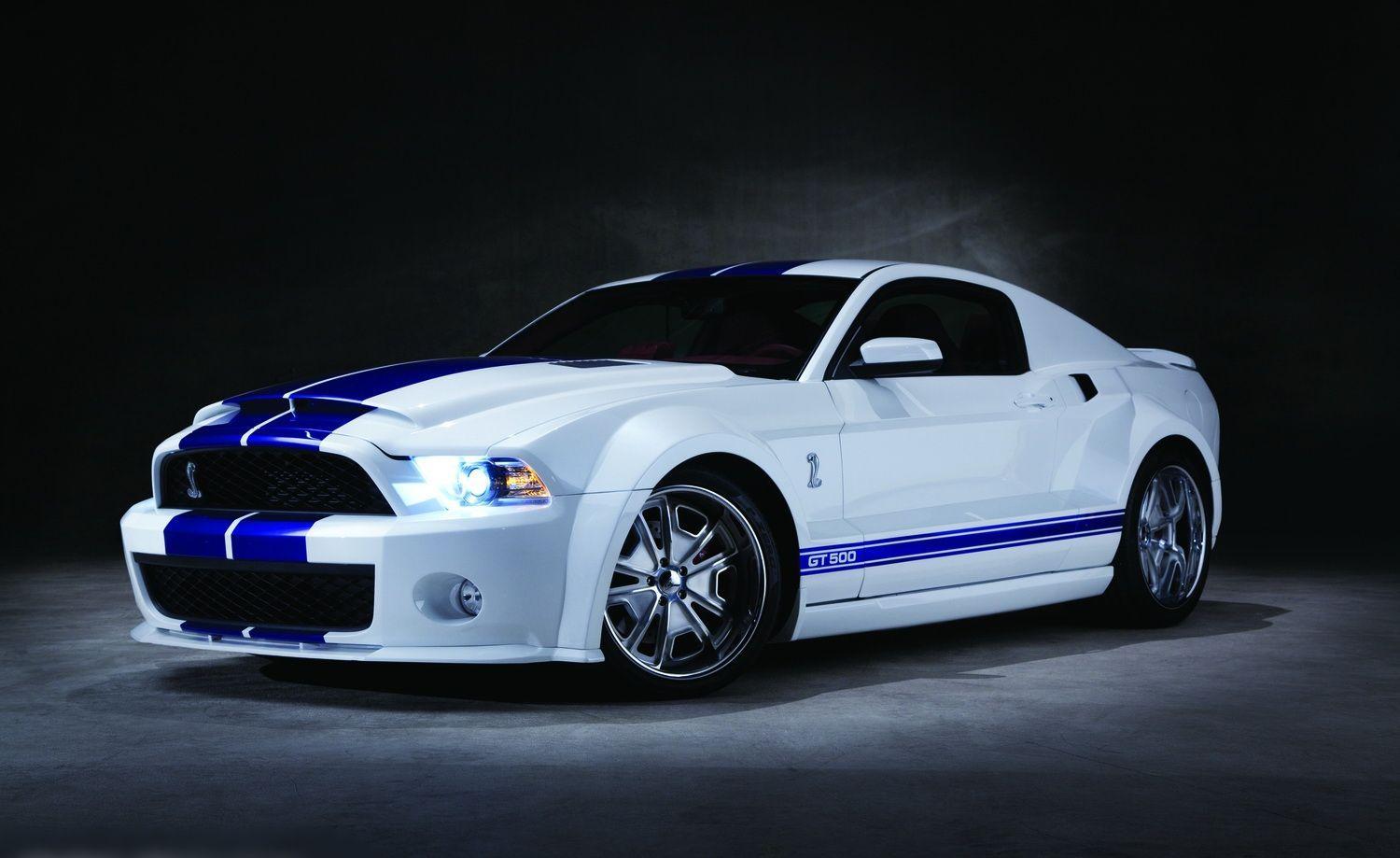 Description: A white and blue mustang car in a dark room with a black background and a spotlight from the front.