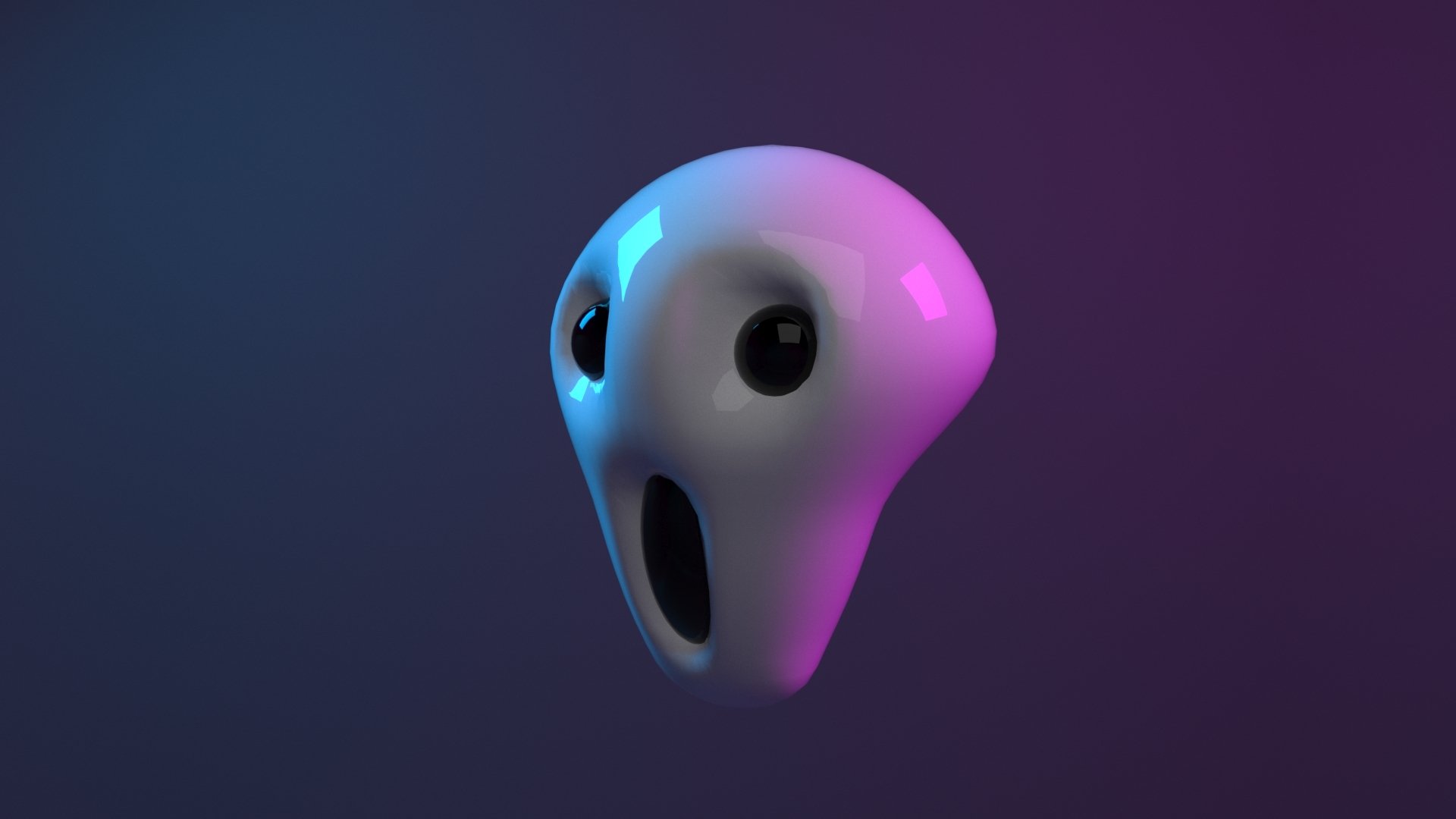 Description: A white and blue object with a black eye and a black nose and a purple background with a black spot.