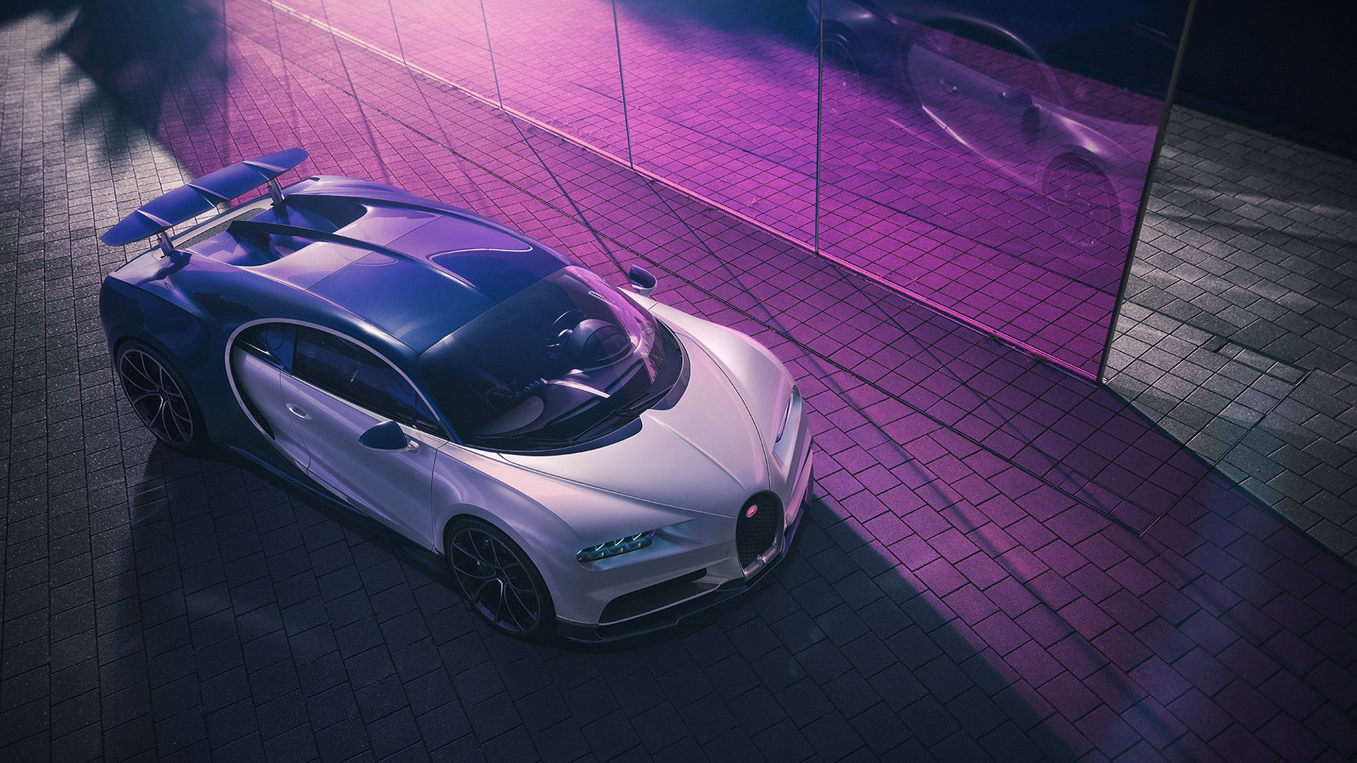 Description: A white and blue sports car parked in a parking lot next to a wall with a mirror on it.