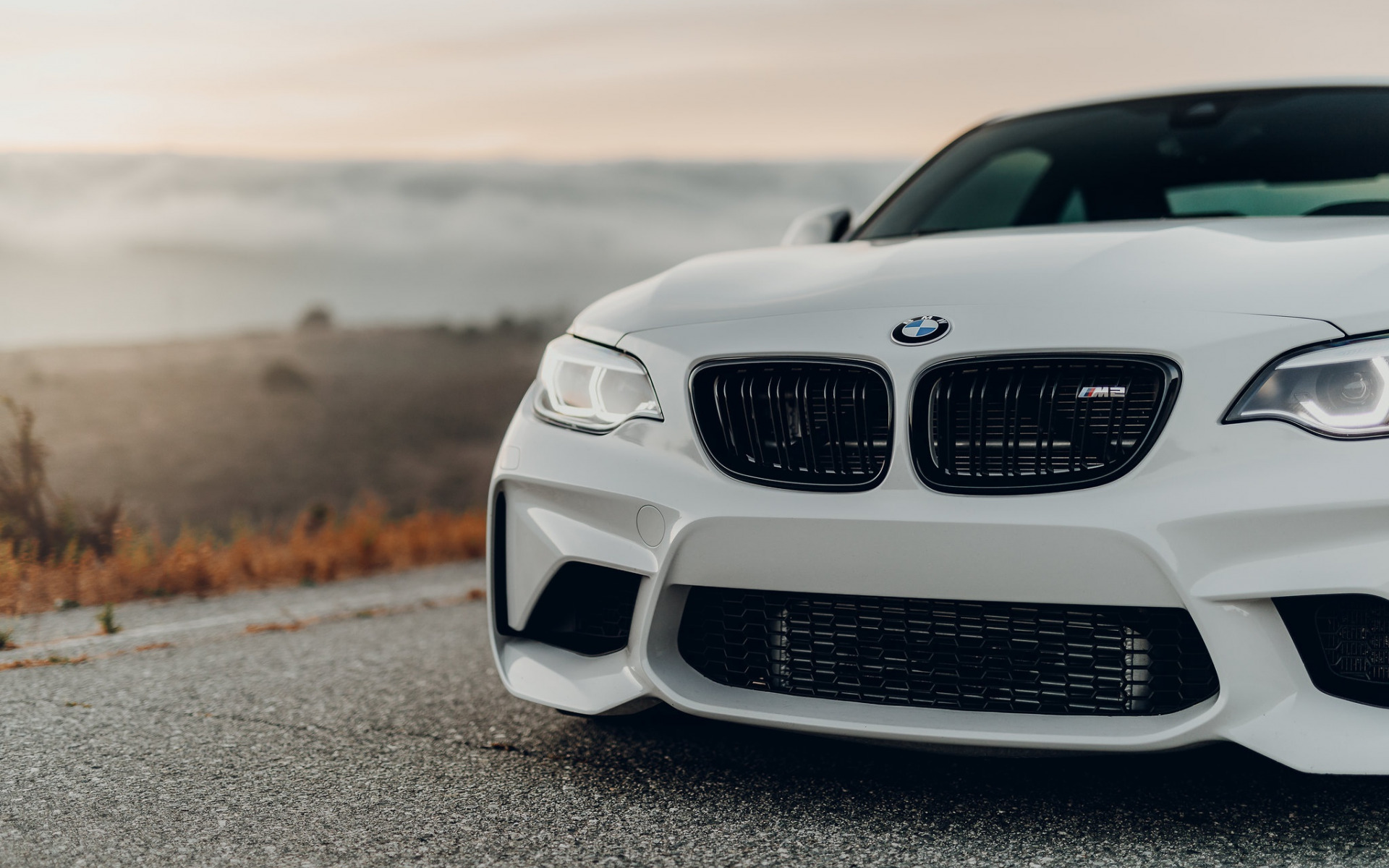 Description: A white bmw car parked on the side of a road with fog in the background and a mountain in the distance.