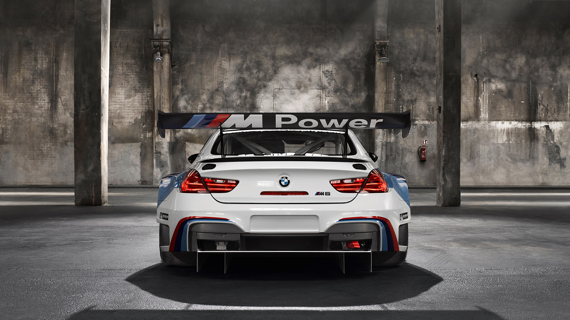 Description: A white bmw car parked in a parking lot with a banner on it's back end that says m power.