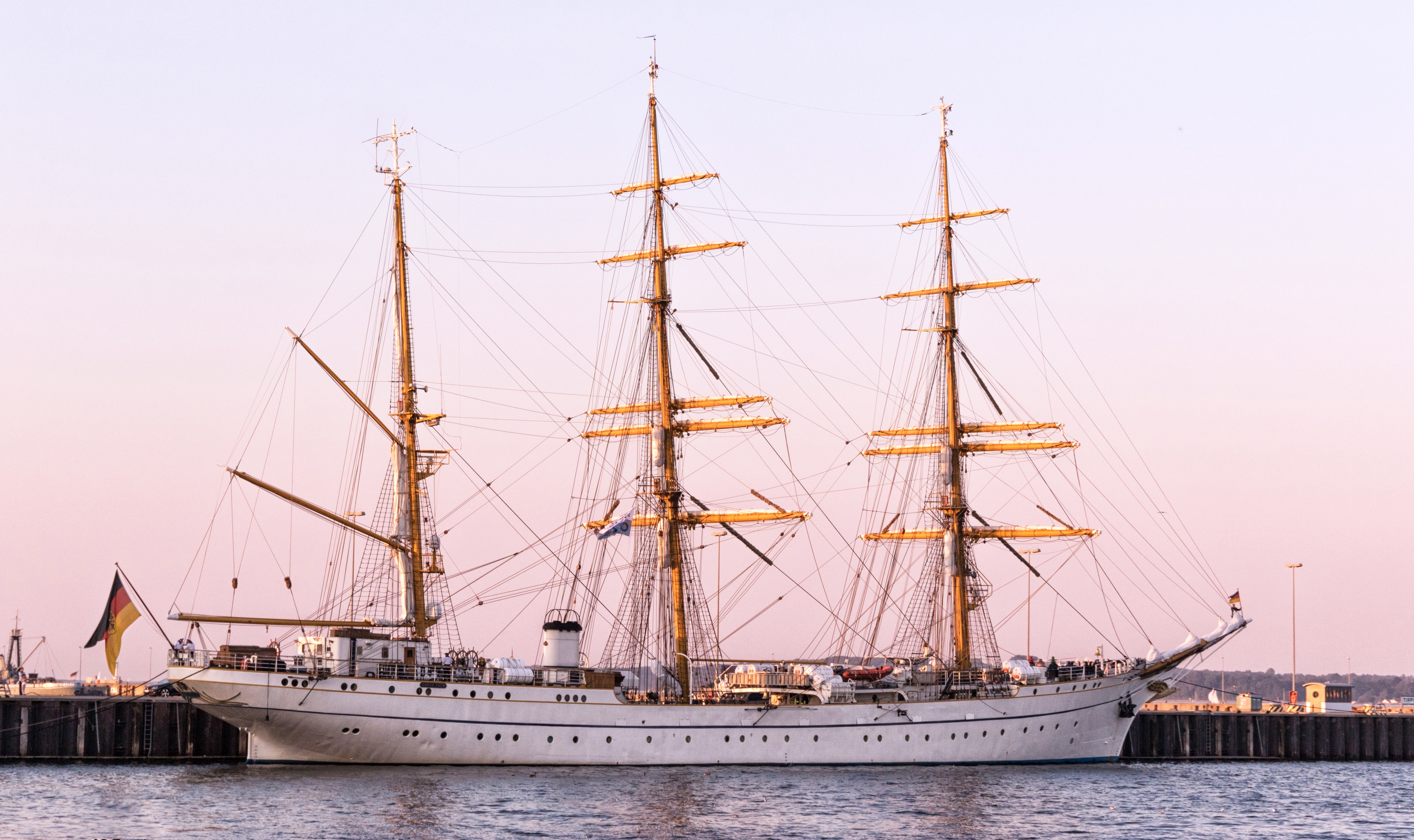 Description: A large white boat in the water near a dock and a pier with a pier and a pier with a boat and a pier with a flag on it.