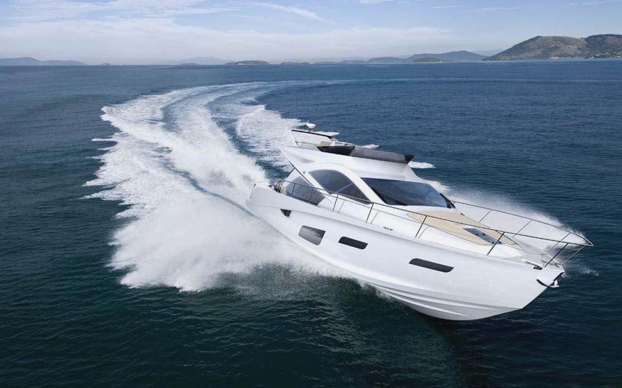 Description: A white boat is traveling through the water with a lot of water behind it and a mountain in the distance.