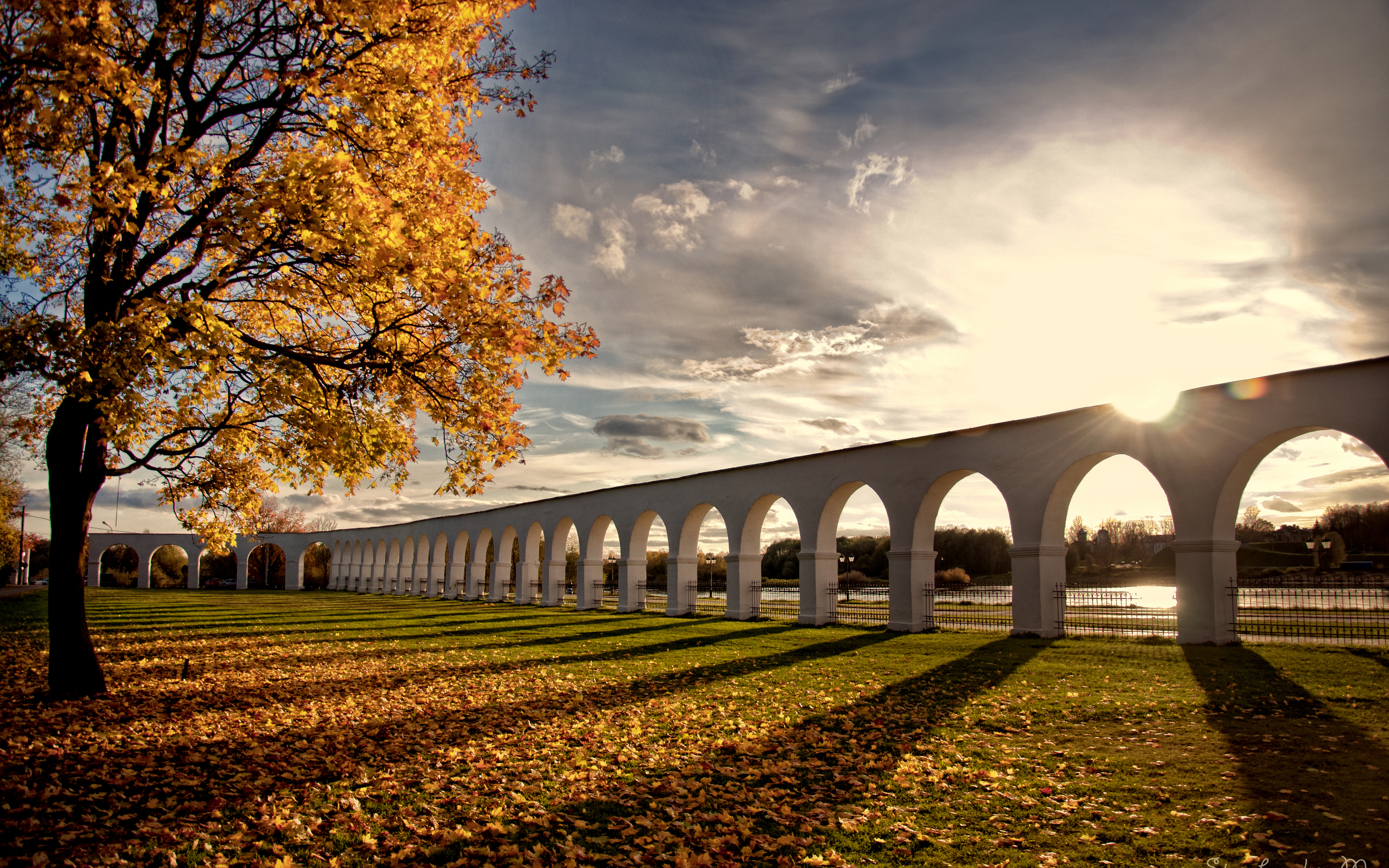 Description: A large white bridge with arches and a tree in the foreground and a lake in the background with a few trees in the foreground.