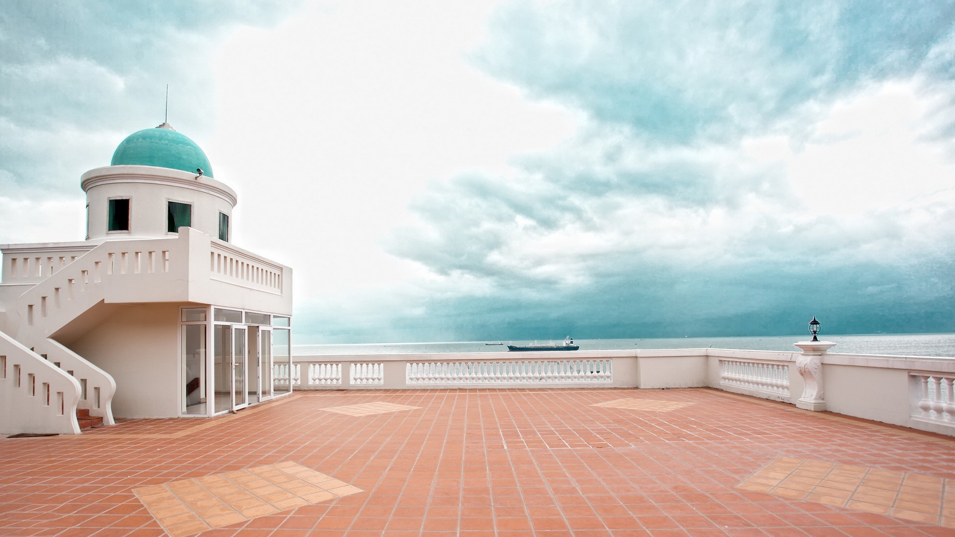 Description: A white building with a green dome on top of it's roof and a red brick walkway leading to the ocean.