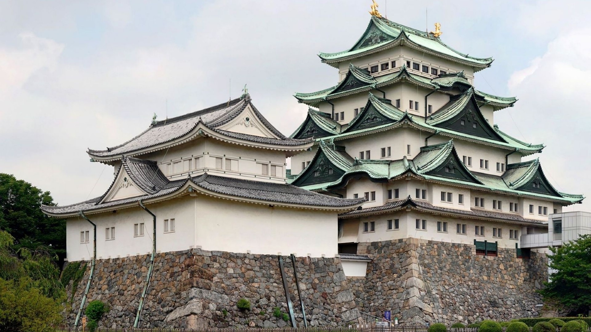 Description: A large white building with a green roof and a stone wall around it and a fence around it and a few trees.