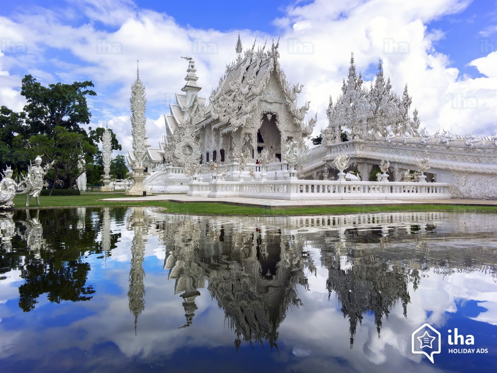 Description: A white building with a large body of water in front of it and a sky background with clouds in the sky.