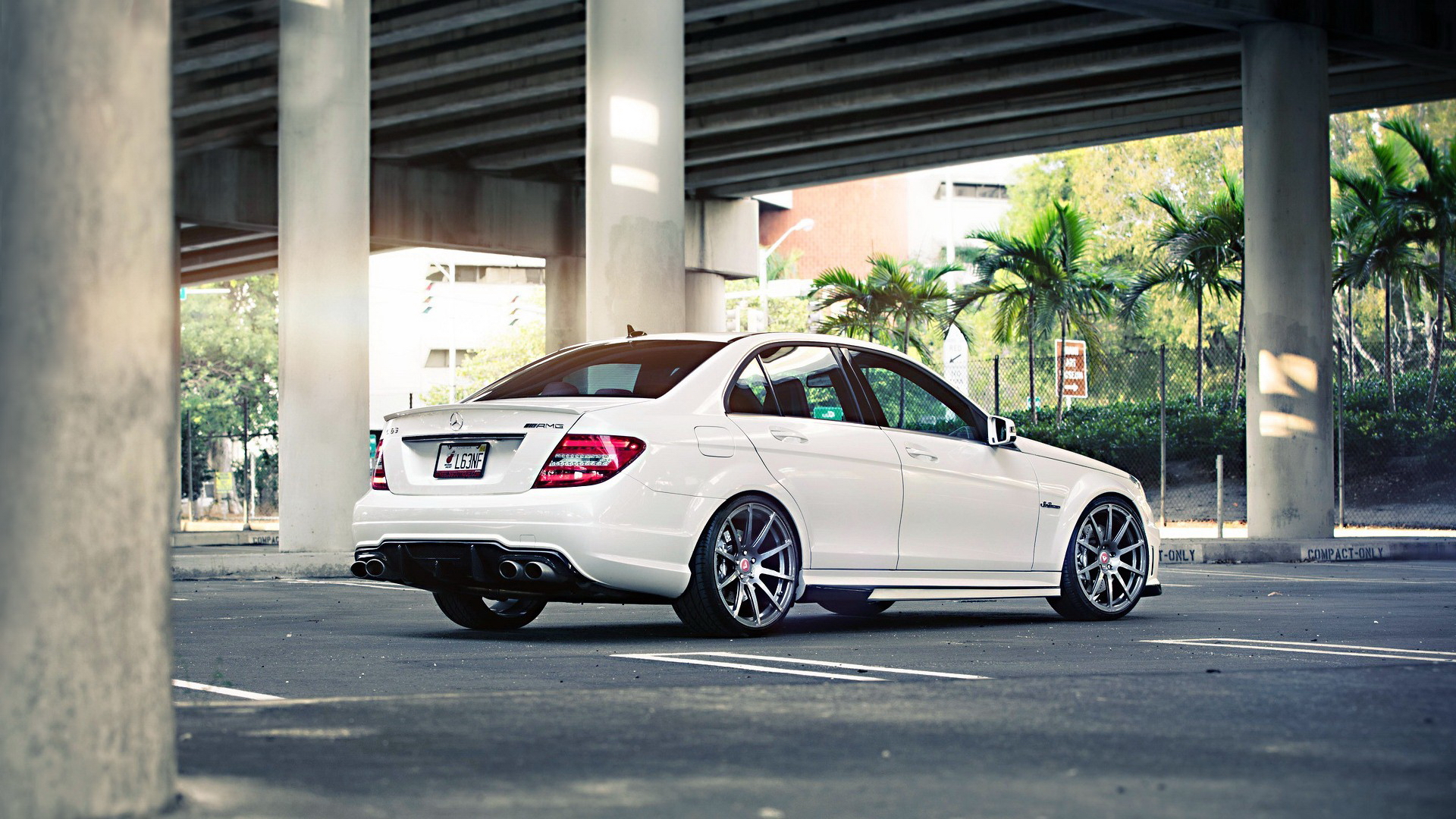 Description: A white car parked in a parking lot under a bridge with columns and palm trees in the background and a person walking by.