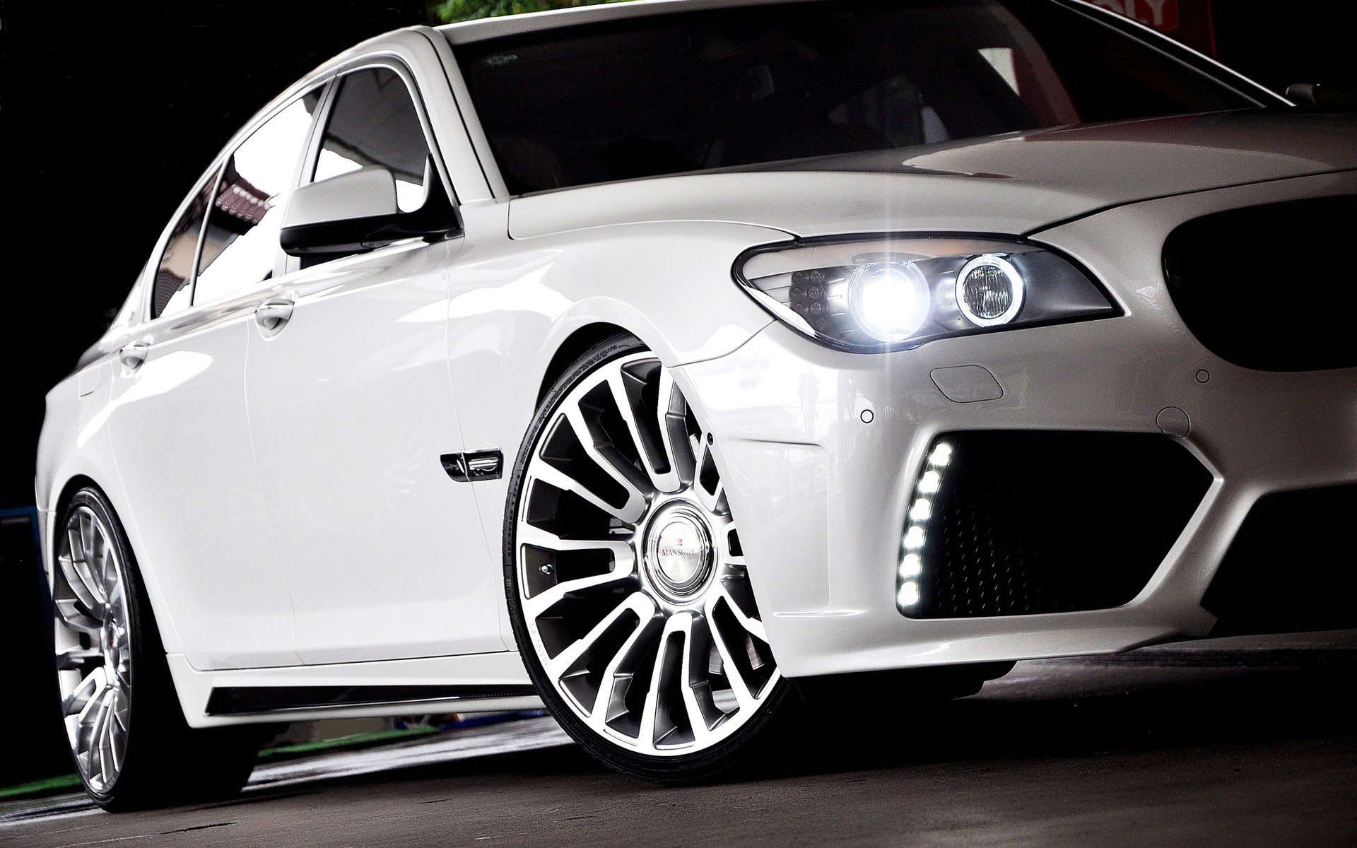Description: A white car with a bright light on it's headlight and a black background behind it is a man in a suit.
