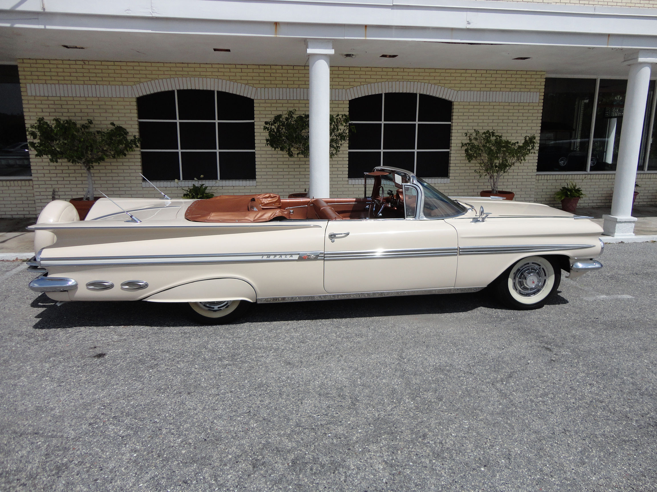 Description: A white car parked in front of a building with a brown leather seat and a tan leather top and a tan leather seat.