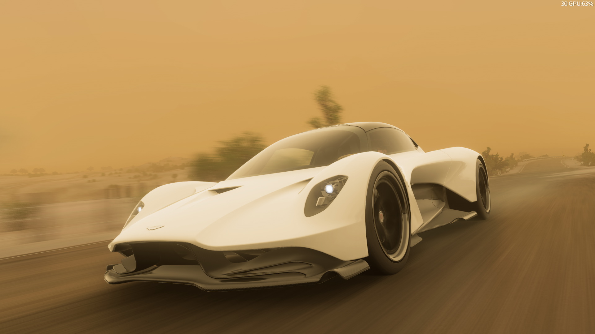 Description: A white car driving down a road with a brown sky in the background and a brown sky in the background.