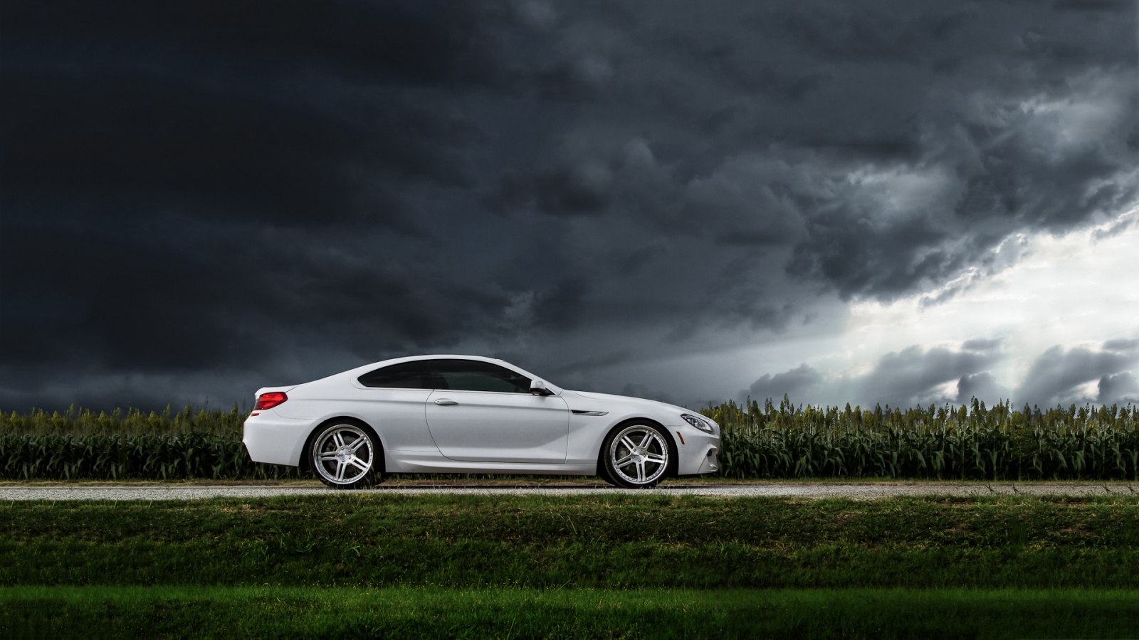 Description: A white car parked on a road under a cloudy sky with corn stalks in the background and a dark cloud.