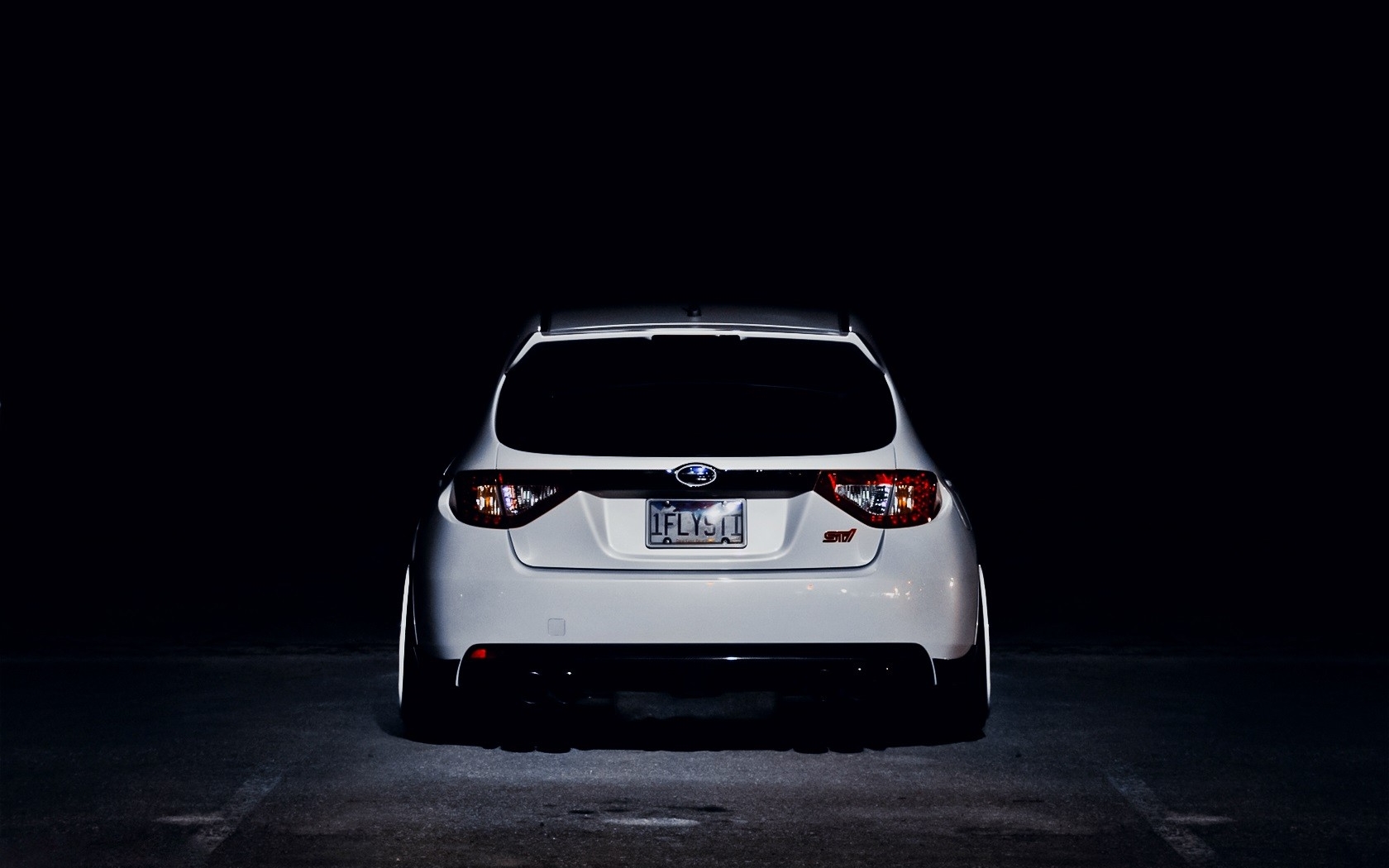 Description: A white car parked in a dark parking lot at night time with the license plate of a car on the back.