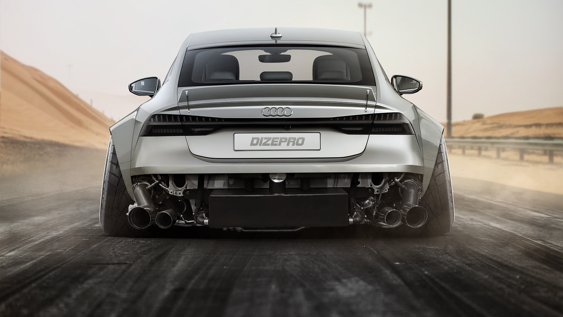 Description: A white car driving down a road next to a desert area with sand dunes in the background and a sky background.