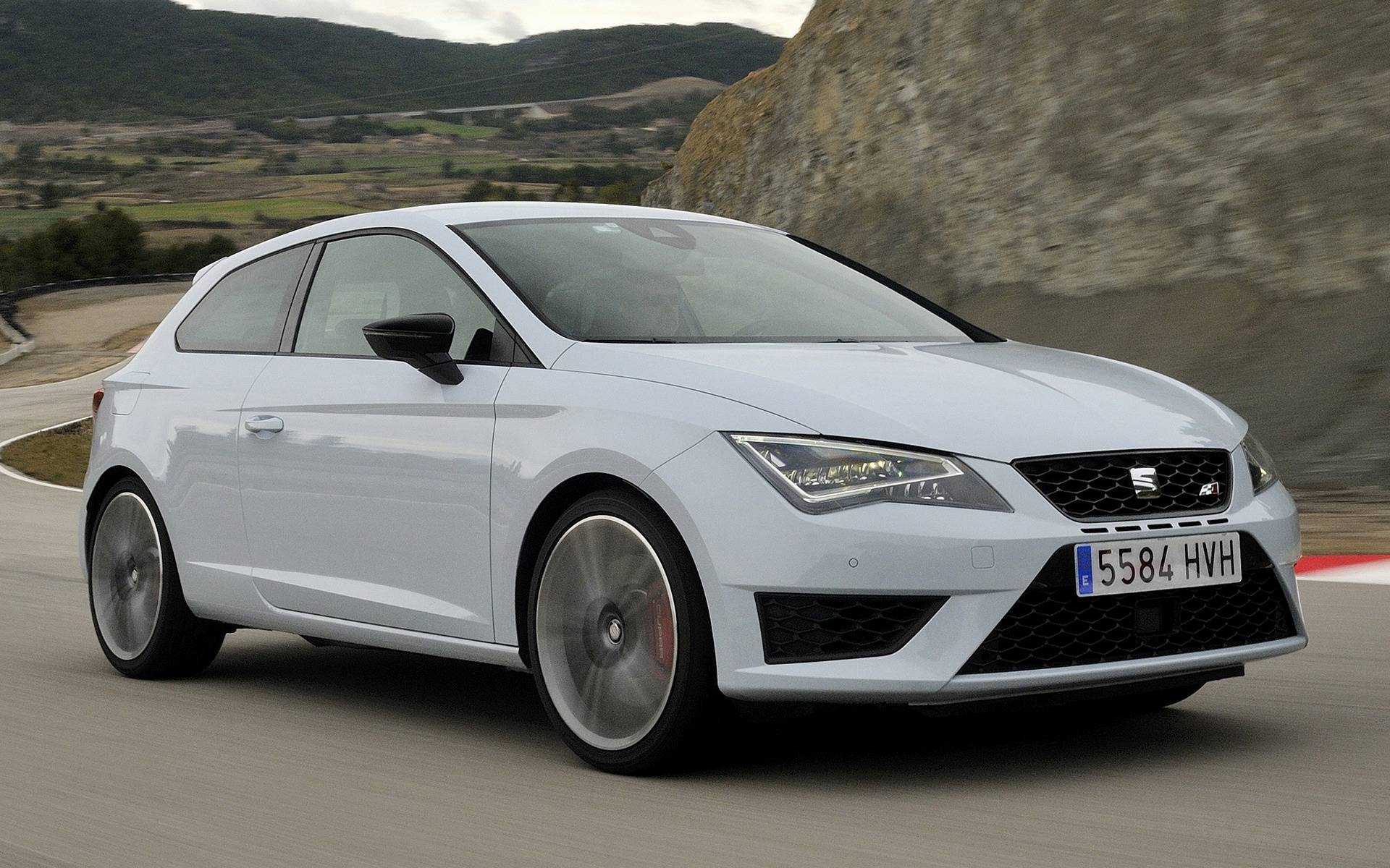 Description: A white car driving down a road next to a mountain side wall and a rock formation behind it with a sign on the front.