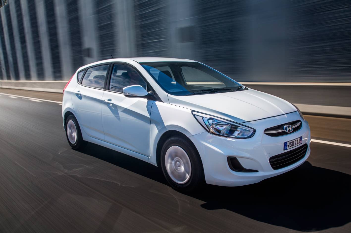 Description: A white car driving down a street next to tall buildings and a building with a clock on it's side.
