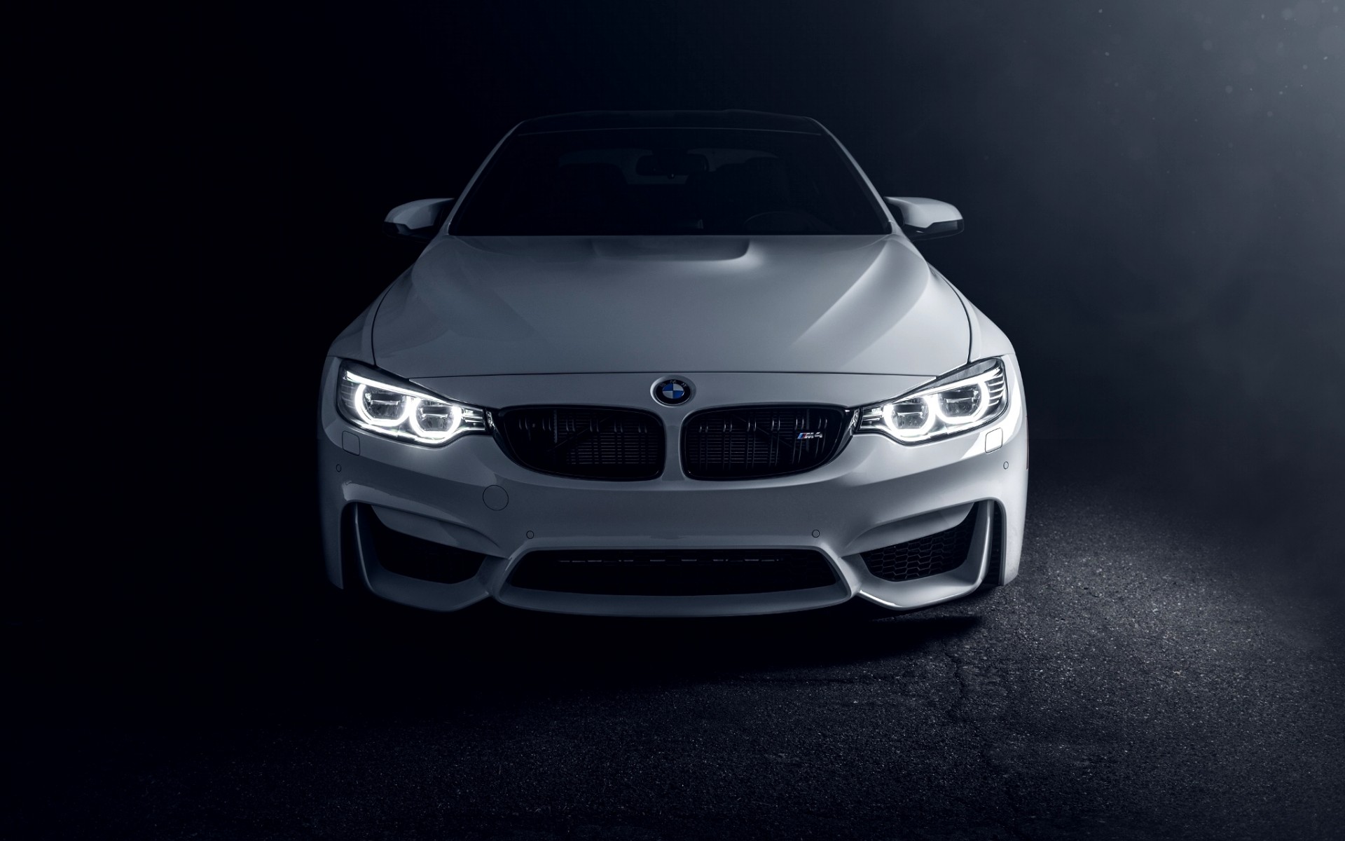 Description: A white car is shown in a dark room with fog coming from behind it and the headlights on the car.