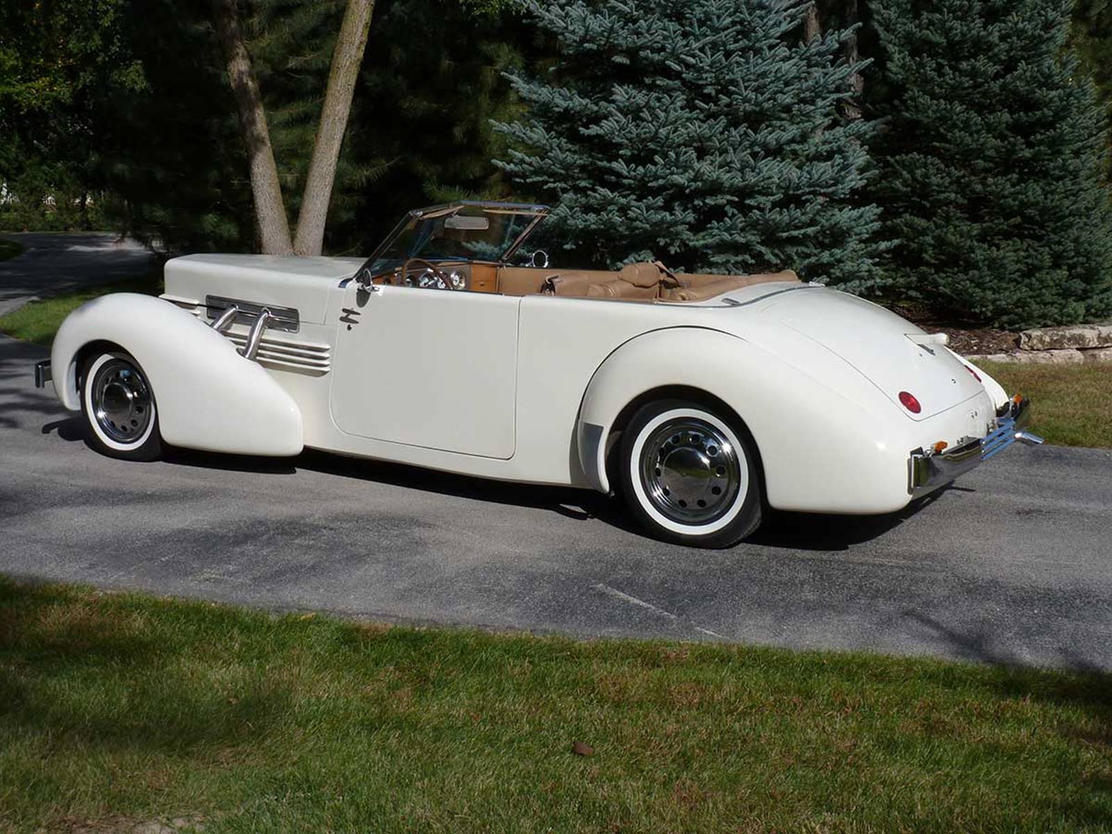 Description: A white car parked on the side of a road next to a forest of trees and grass on a sunny day.