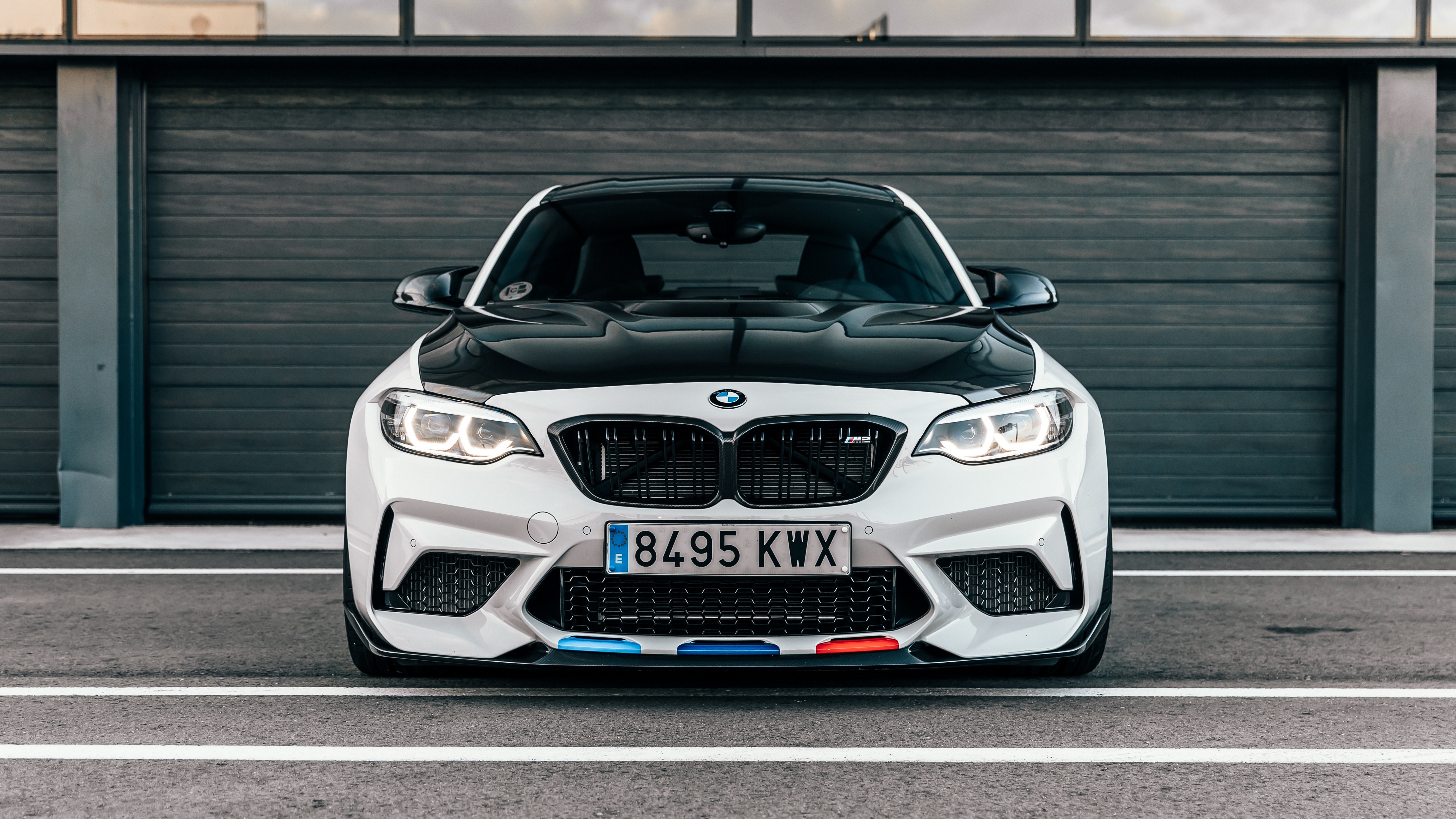 Description: A white car parked in front of a garage door with a black hood and hood vents on it's hood.