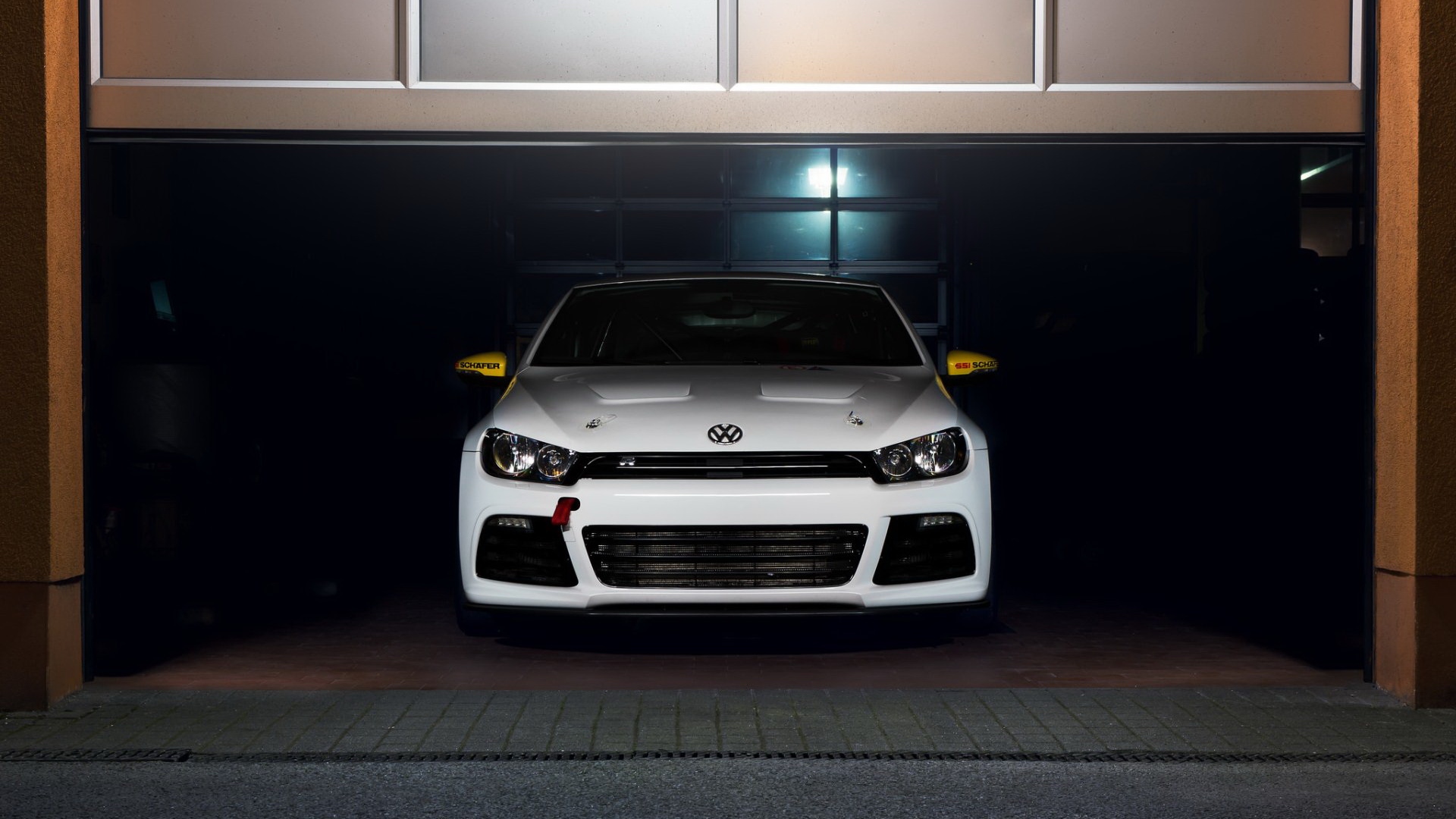 Description: A white car is parked in a garage with its lights on and the front lights on and the hood up.