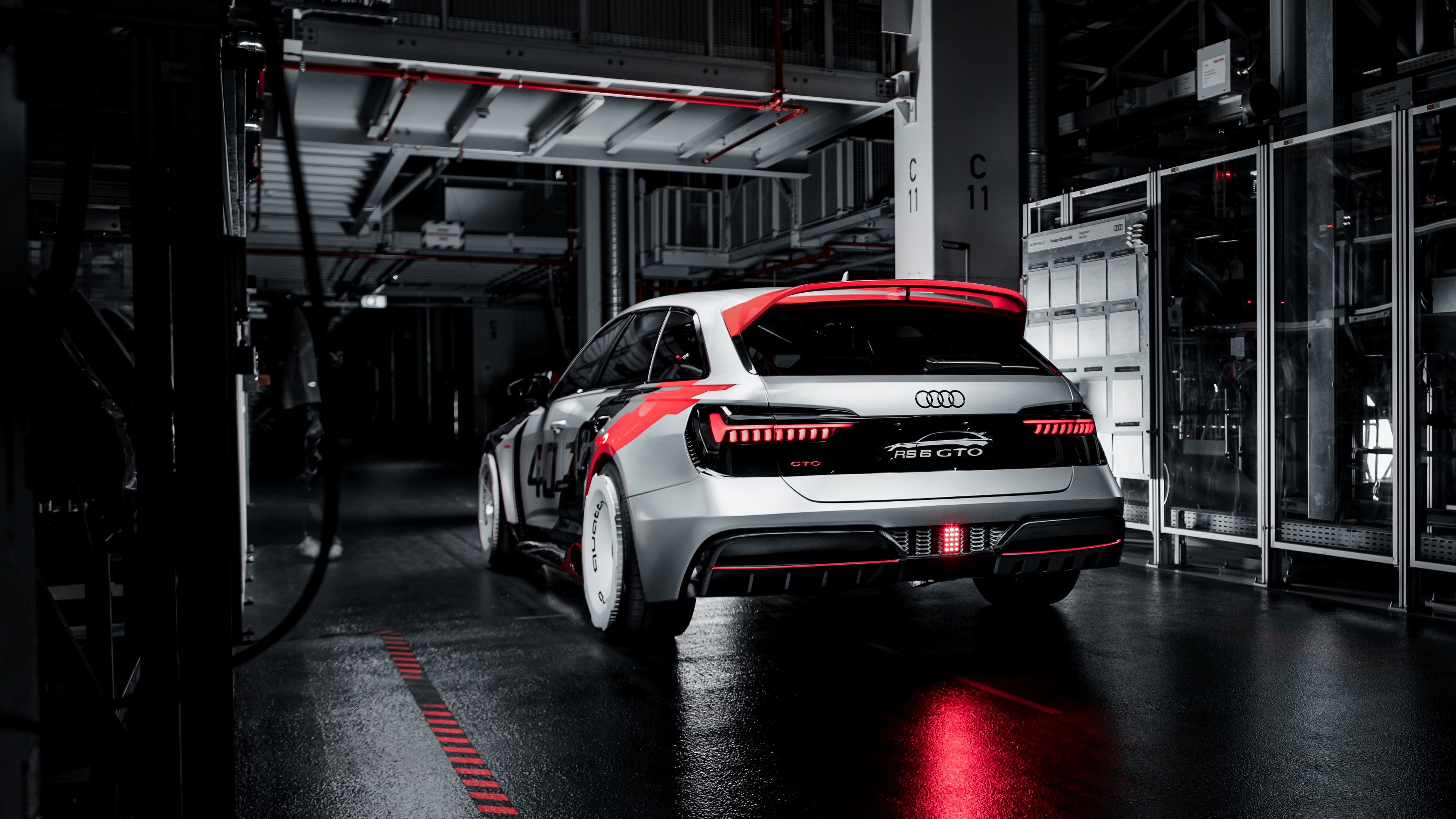 Description: A white car parked in a garage with red lights on it's hood and tail lights on the back.