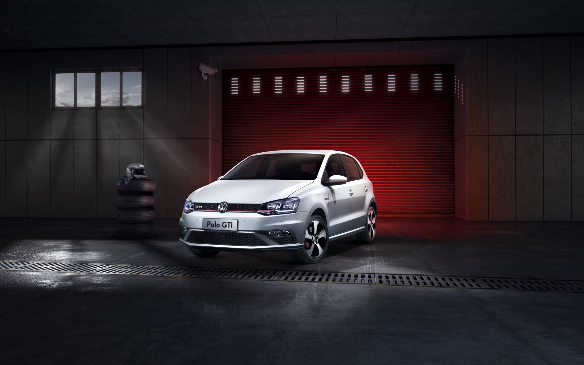 Description: A white car parked in a garage with a red light on it's side and a red light on the door.
