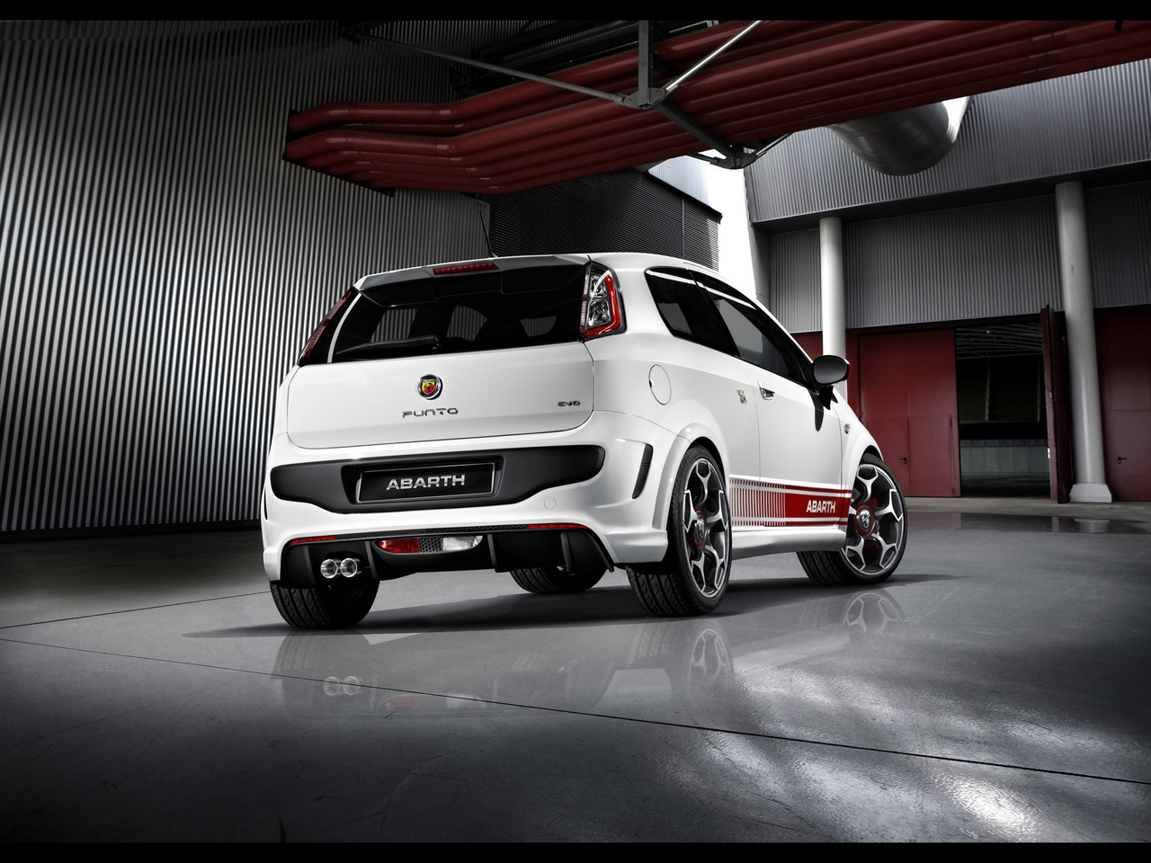 Description: A white car parked in a garage next to a red wall and a red and white ceiling light and a red and white wall.