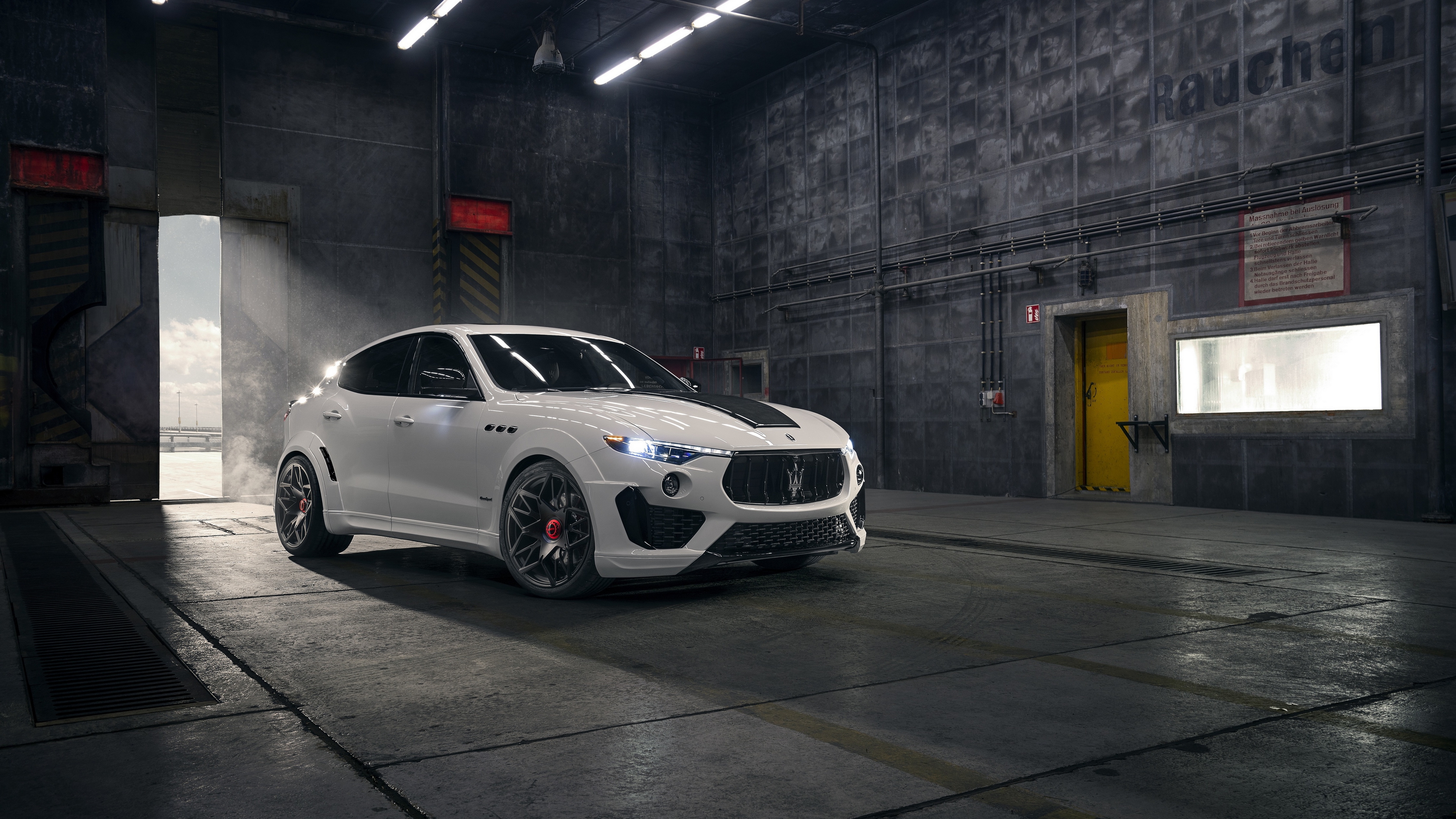Description: A white car parked in a garage with a yellow door and a black and white car in the background.