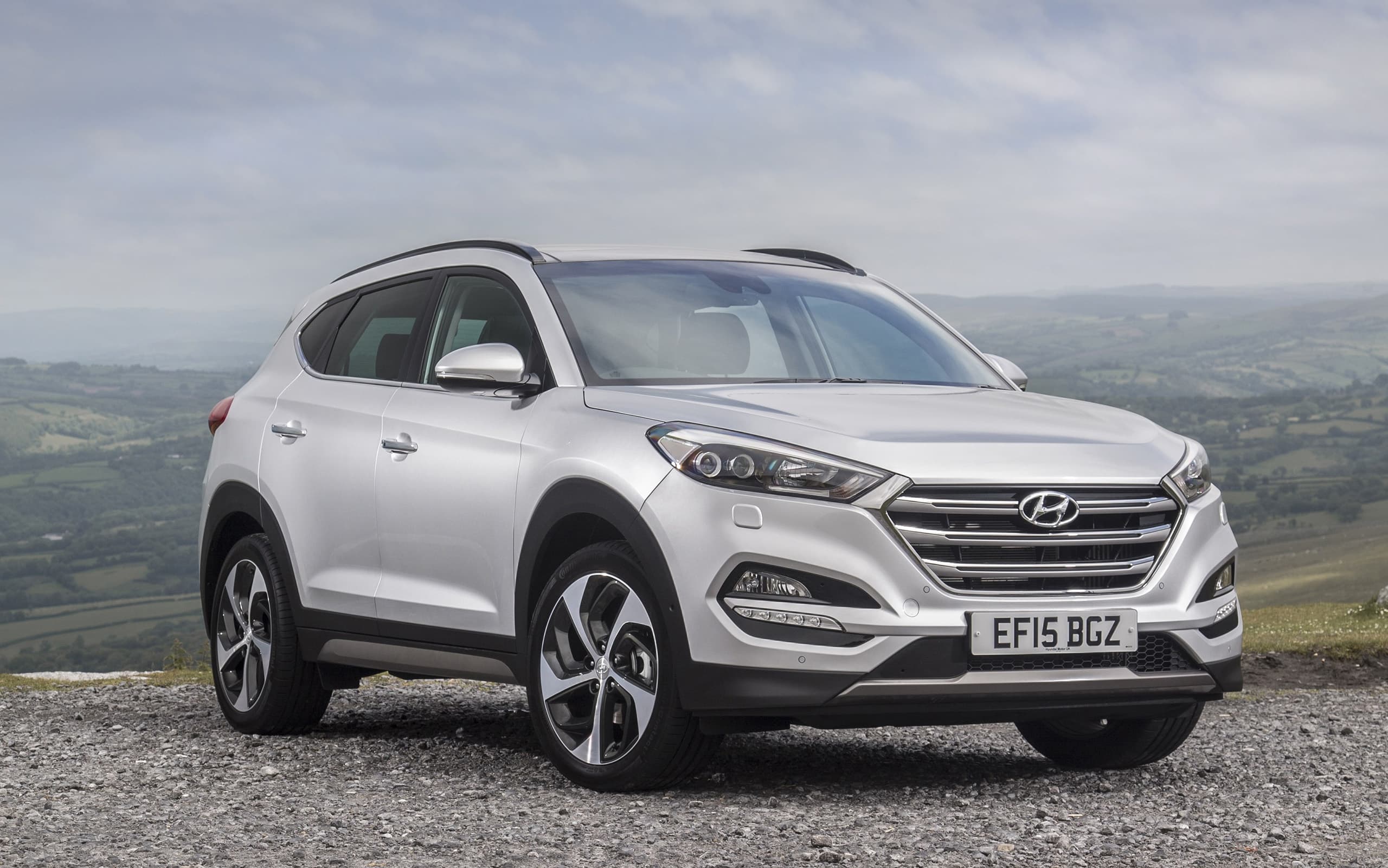 Description: A white car parked on top of a hill near a valley and mountains in the background with a cloudy sky.