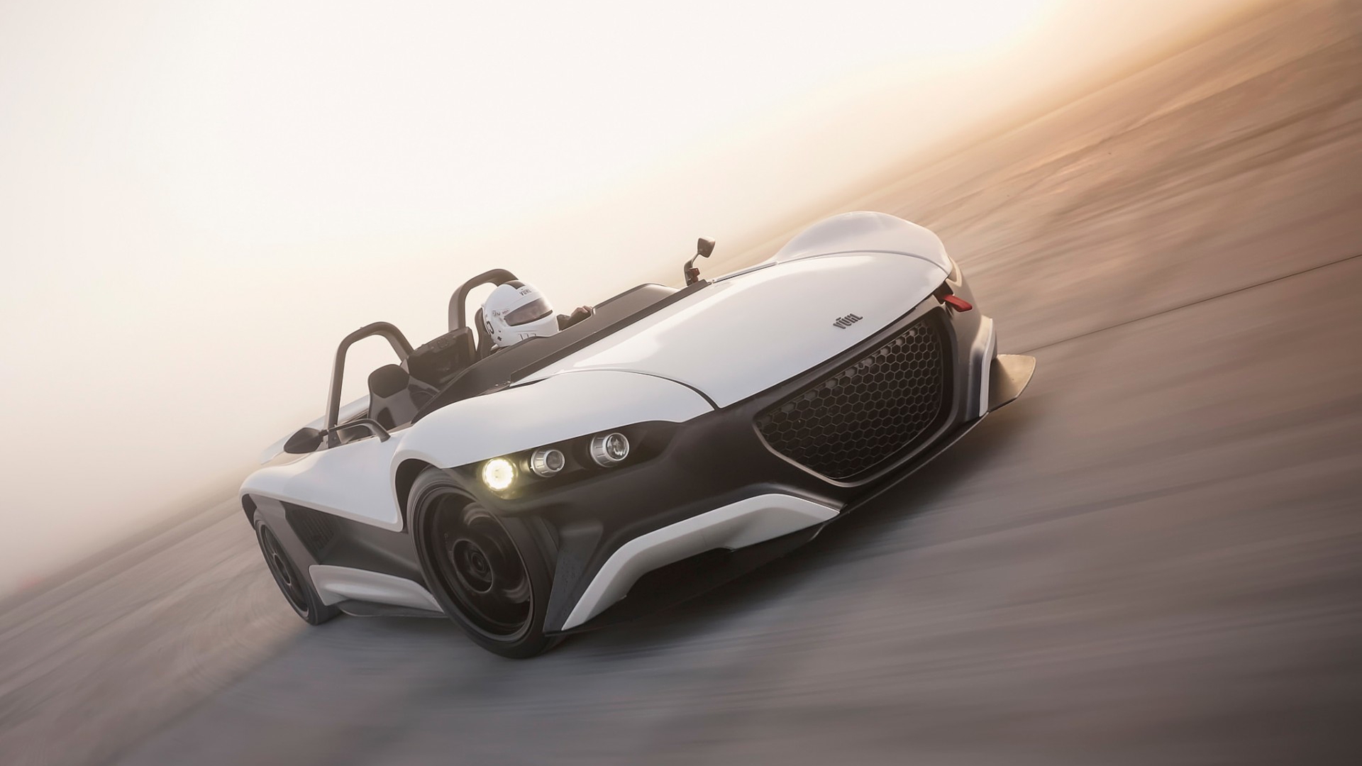 Description: A white car driving down a road next to a hillside with fog on it's sides and a sunlit roof.