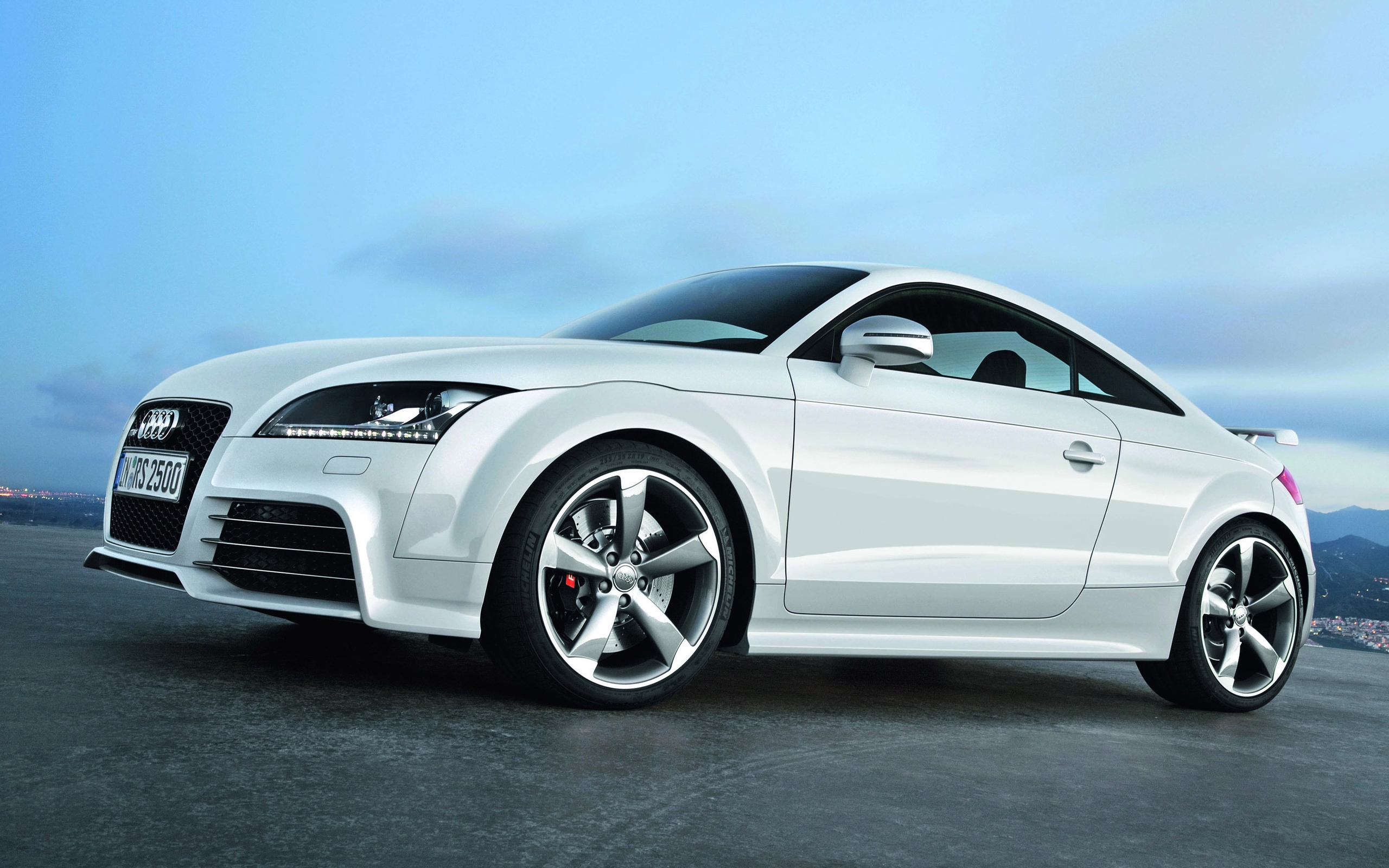 Description: A white car parked on a parking lot with mountains in the background and a blue sky in the background.