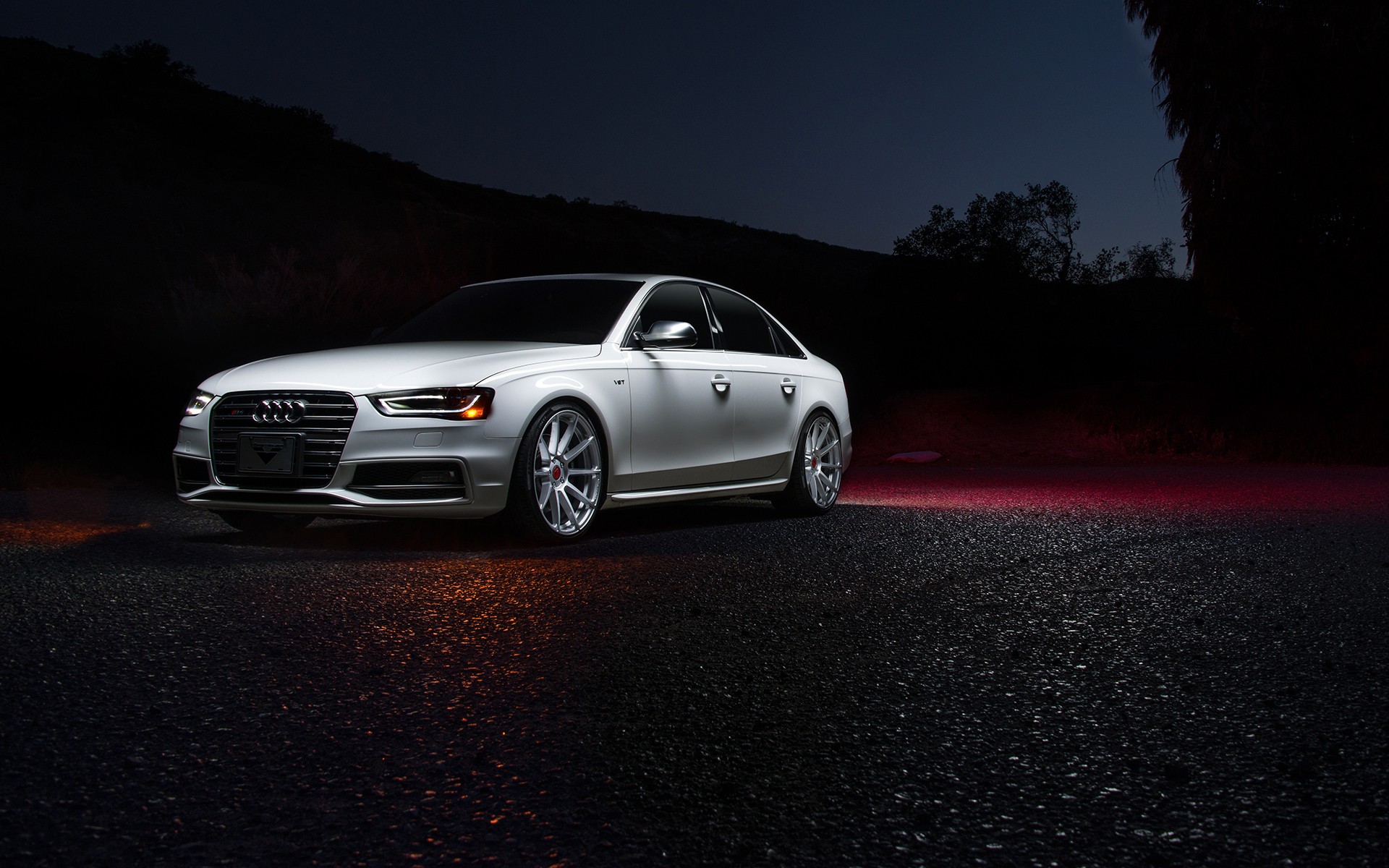 Description: A white car parked on the side of a road at night with a red light on it's side.