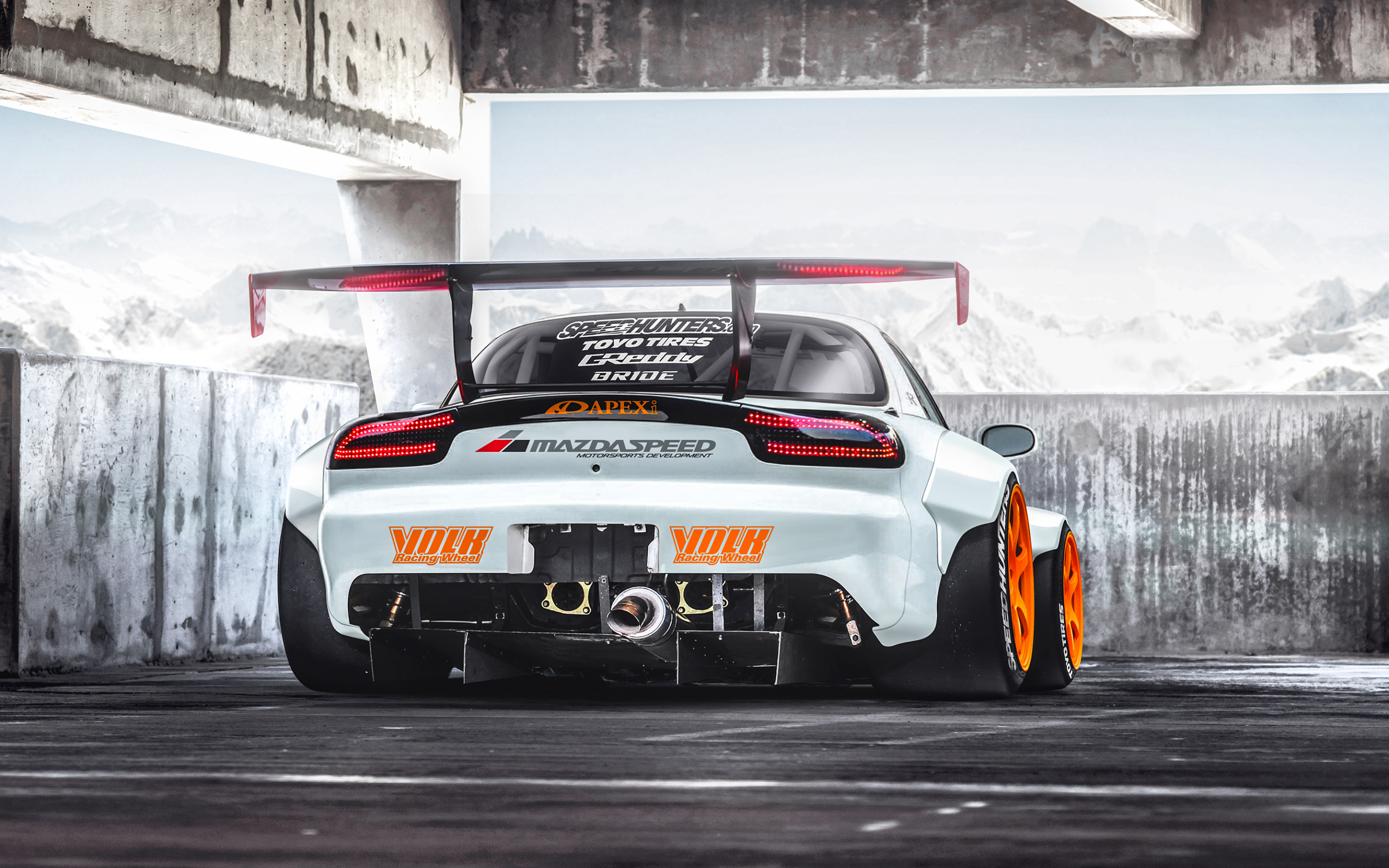Description: A white car with orange rims parked in a parking lot with a mountain in the background and a sign on the back of the car.