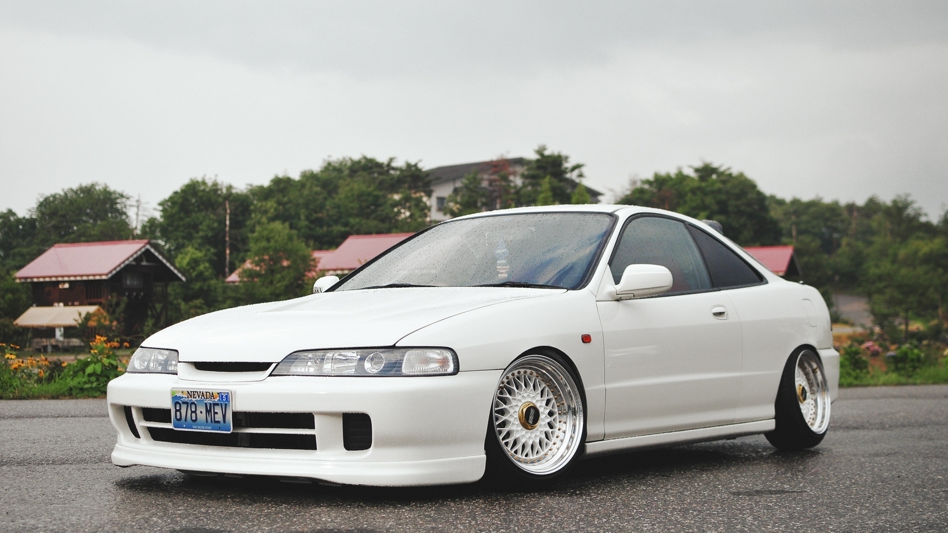 Description: A white car parked on a street next to a forest and a house with a red roof and a red roof.