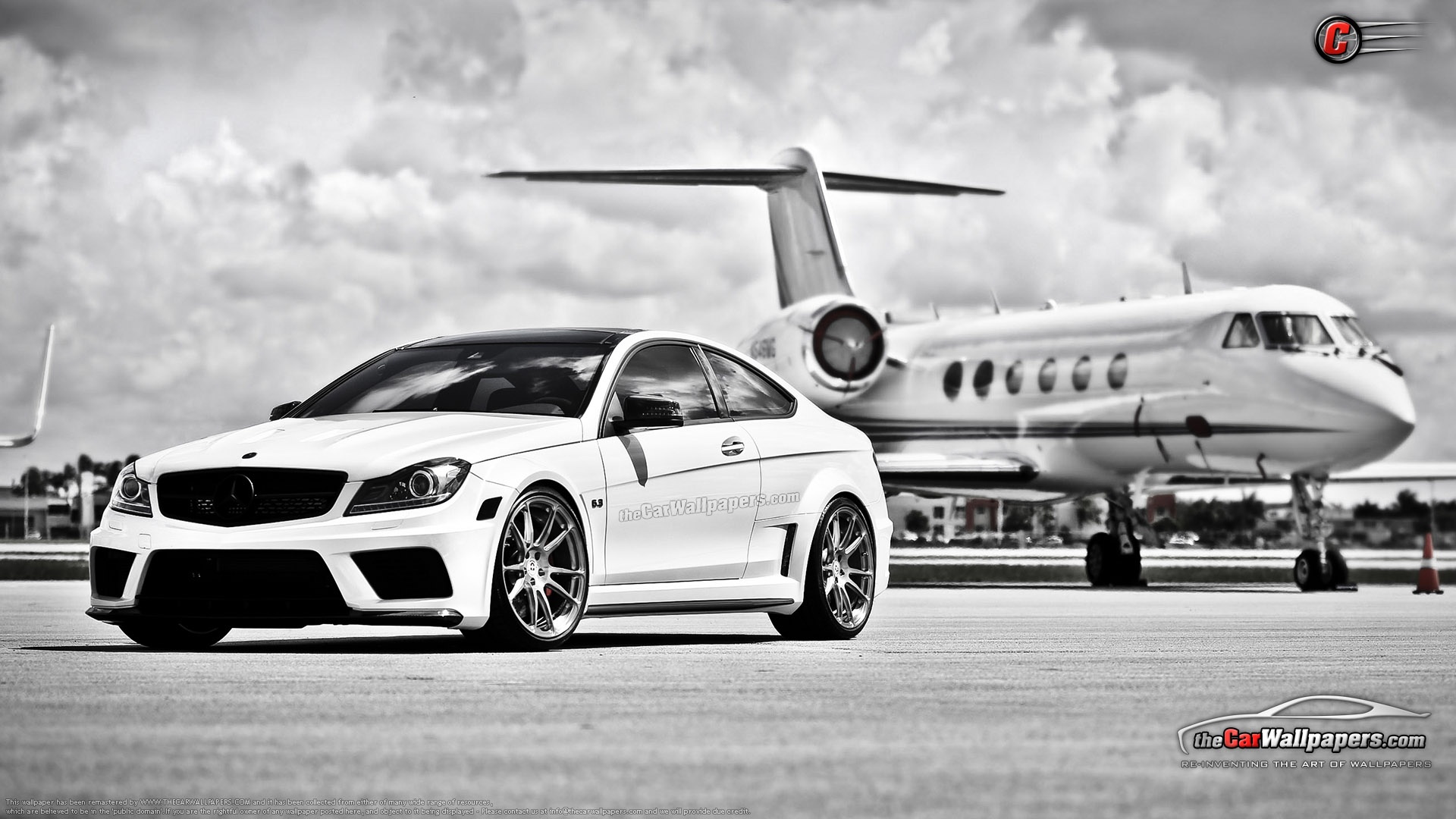 Description: A white car parked in front of a jet airliner on a runway with a plane in the background.