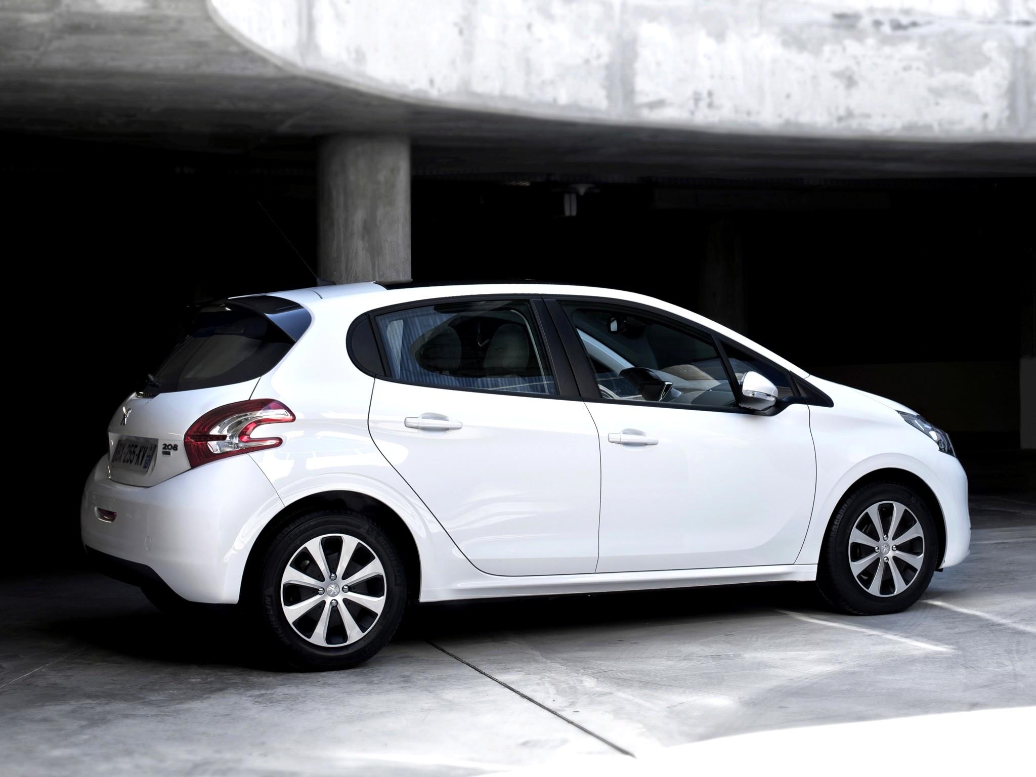 Description: A white car parked in a parking garage next to a building with a concrete wall and a concrete floor.