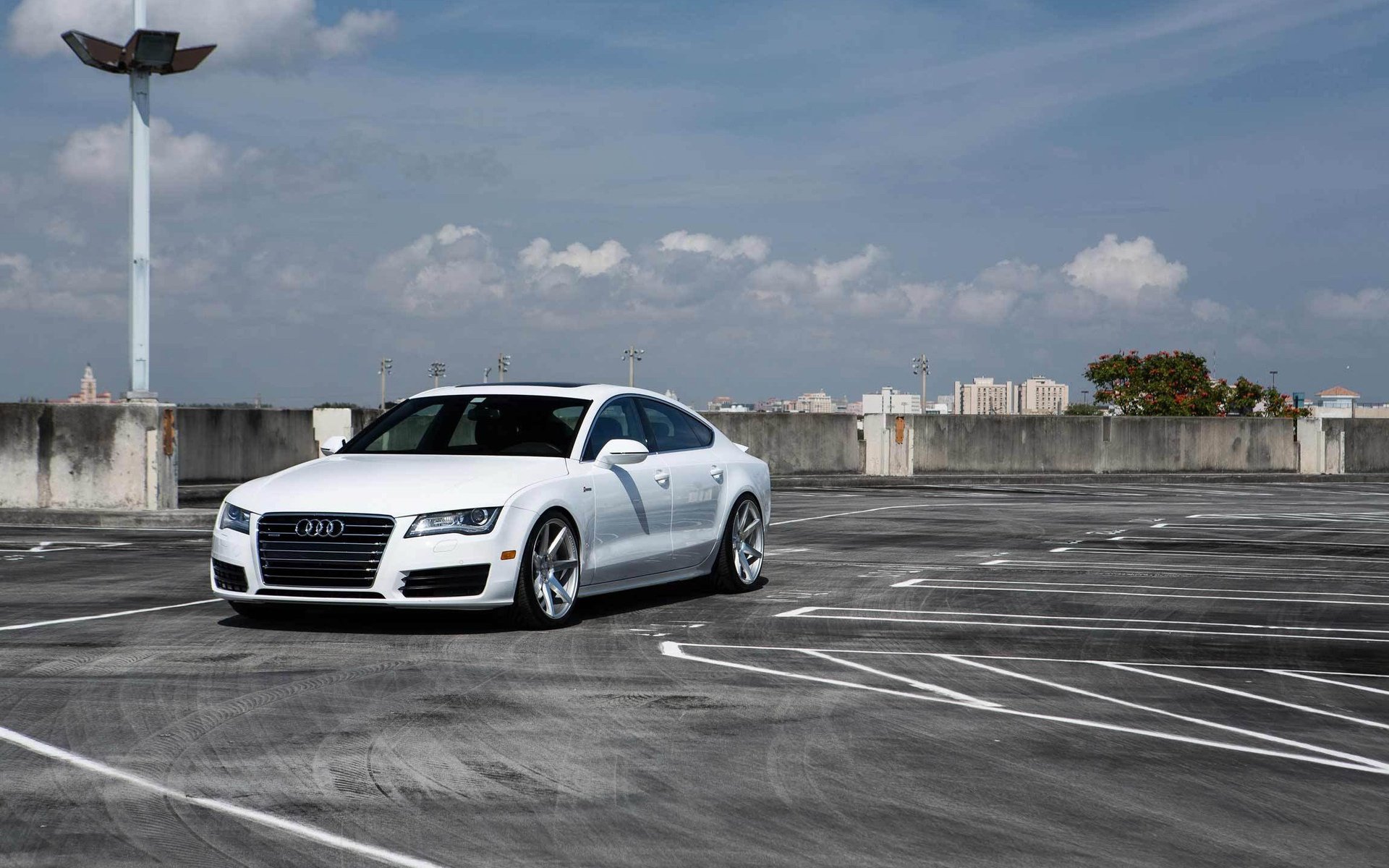 Description: A white car parked in a parking lot next to a light pole and a building with a clock on it.