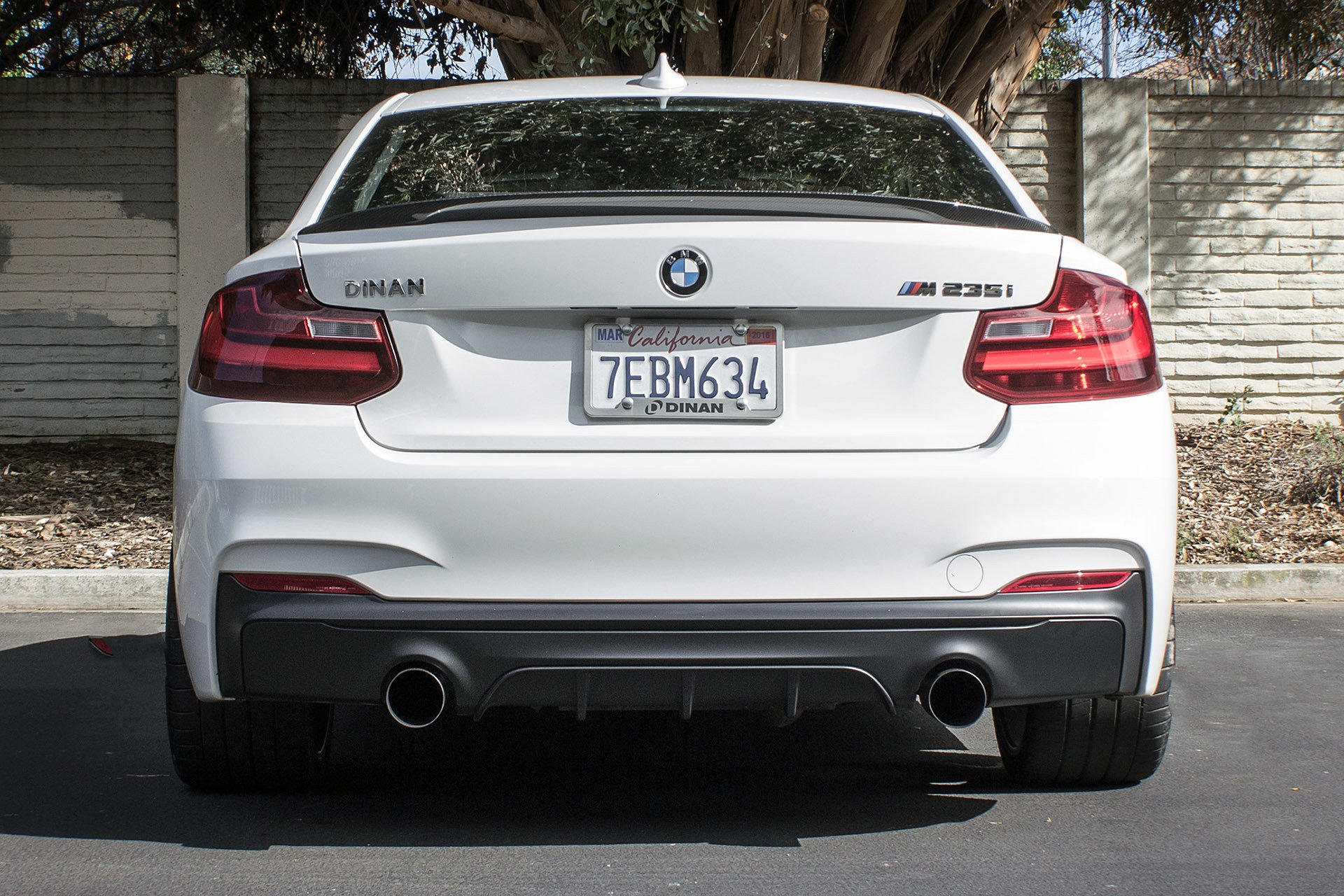 Description: A white car parked in a parking lot next to a tree and a building with a sign on it.