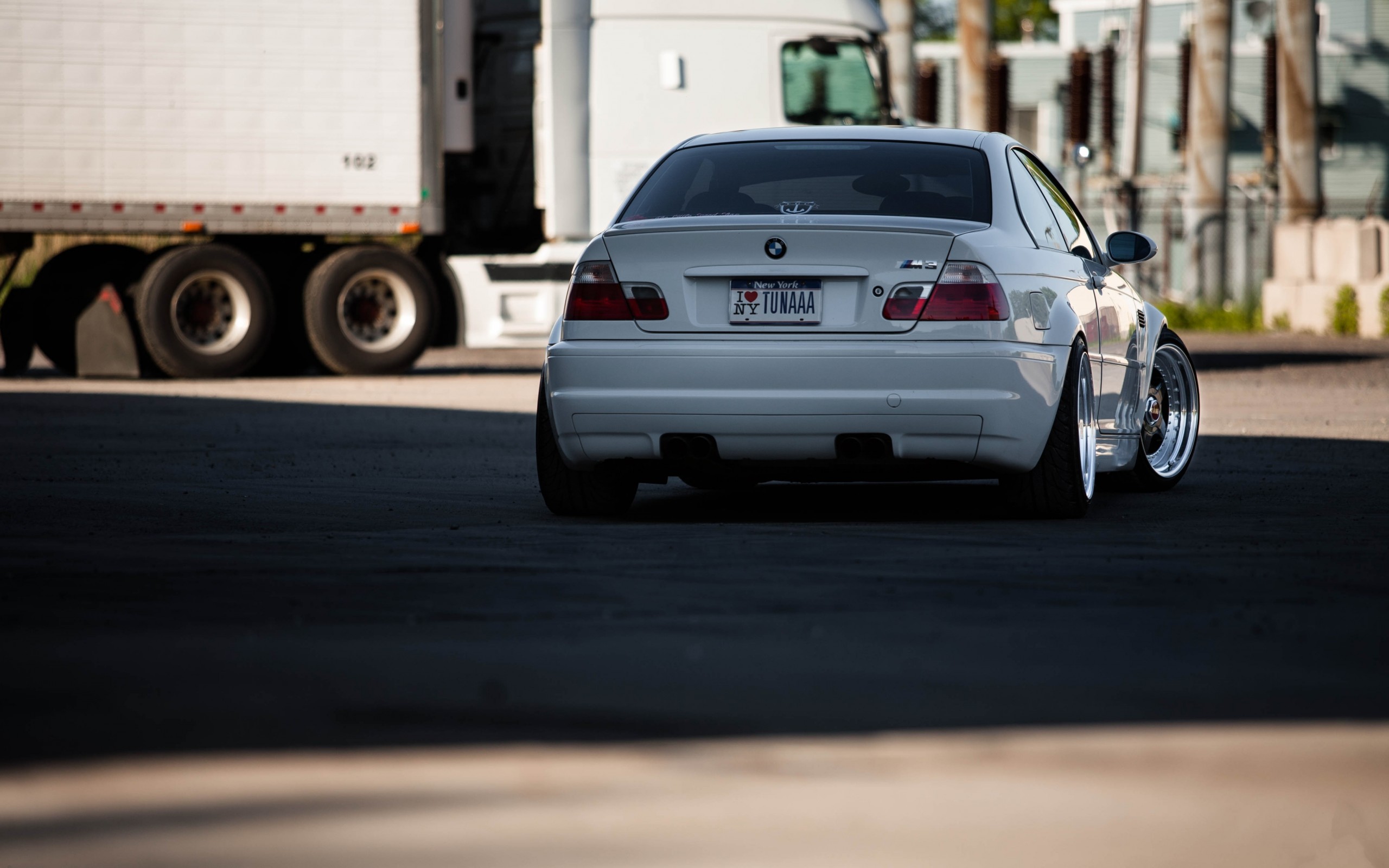 Description: A white car parked in a parking lot next to a truck and a building with a large trailer behind it.